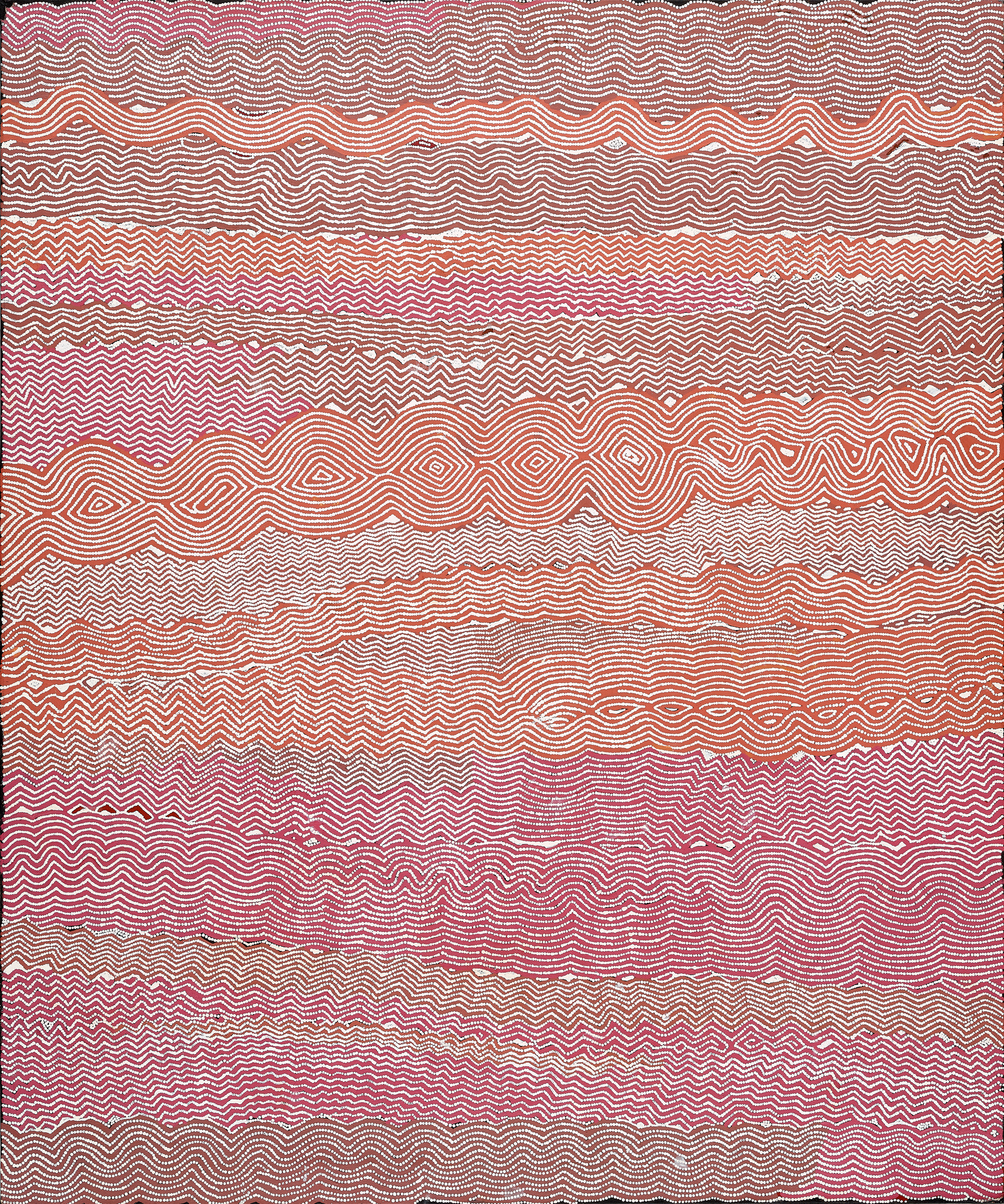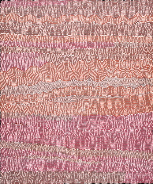 This work is accompanied by a certificate of authenticity from Papunya Tula Artists which states in part: 'This painting depicts designs associated with the rockhole site of Palipalantja, west of Jupiter Well. In Mythological times a large group of Tingari Men camped at this site before continuing their travels north-east through Tarkul to Lake Mackay. Since events associated with the Tingari Cycle are of a secret nature, no further detail was given. Generally, the Tingari are a group of mythical characters of the Dreaming who travelled over vast stretches of the country performing rituals and creating and shaping particular sites. The Tingari Men were usually followed by Tingari Women and accompanied by novices and their travels and adventures are enshrined in a number of song cycles. These mythologies form part of the teachings of the post initiatory youths today as well as providing explanations for contemporary customs.’