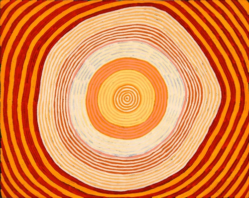 Ronnie Tjampitjinpa’s later paintings are reductive and vivid optical works that pulsate with energy and this distinctive aesthetic is exemplified by Palkarulkulnga, 2002. In this painting, Tjampitjinpa has taken a single component from his visual lexicon, the roundel. Comprised of ever-larger ovoid bands of alternate colours that radiate out from the centre, the roundel has evolved into a single monumental form. This upscaled geometric element representing just one part of the Tingari story, is the result of two decades of refinement by the artist in charting the vast terrain of the Western Desert in his own deft visual language.