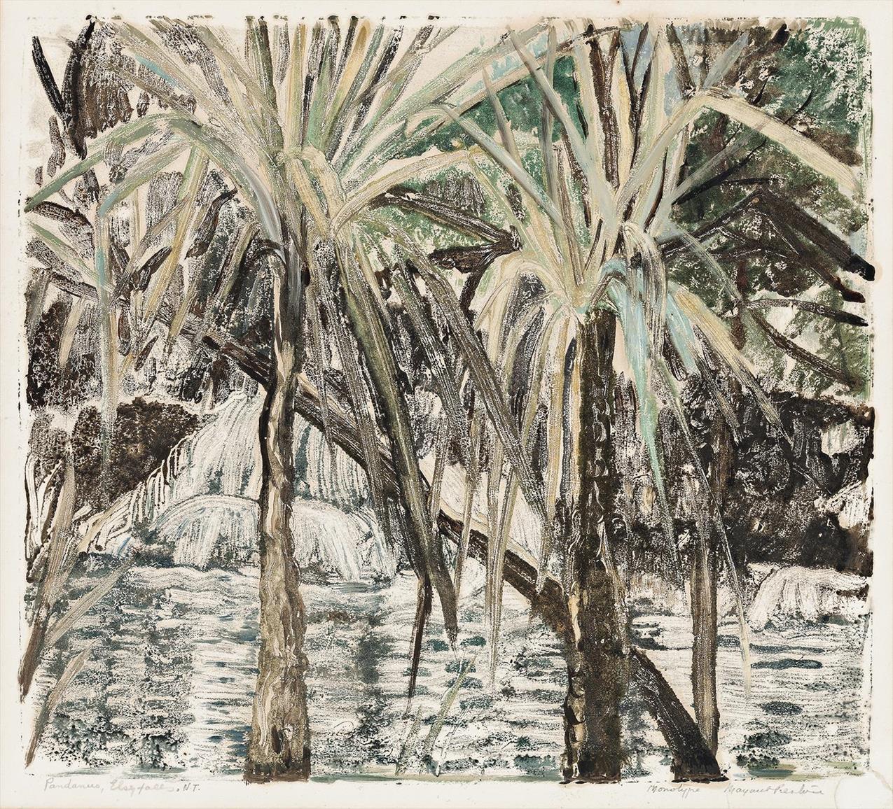 signed and inscribed with title below image: Pandanus, Elsy [sic] Falls. N.T. Monotype Margaret Preston