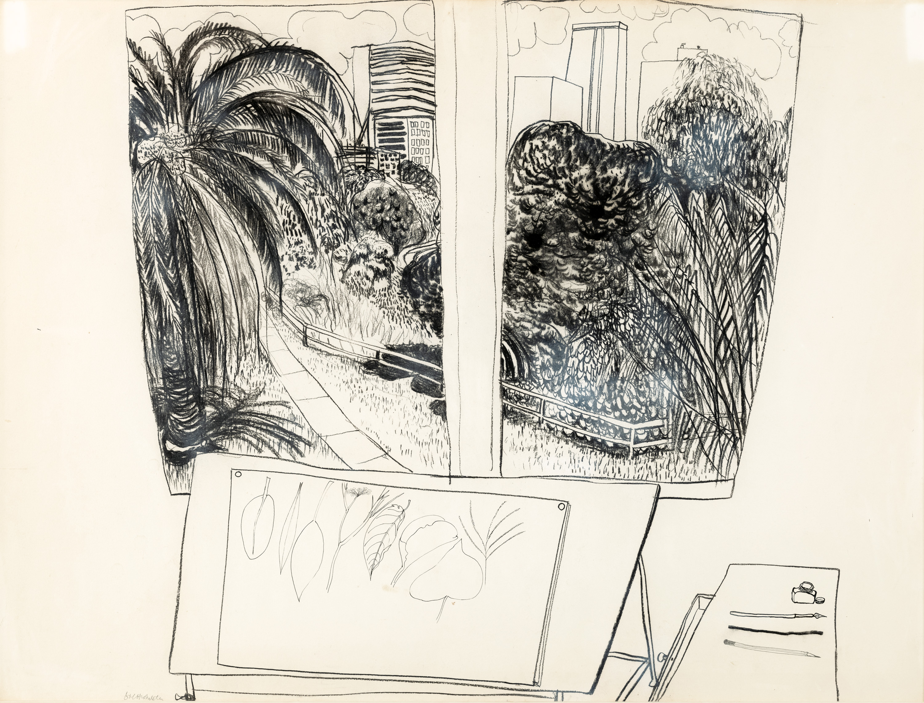 Drawing was the cornerstone of Brett Whiteley’s artistic practice and many of his greatest paintings were accompanied by a series of works on paper featuring alternate compositional emphases. With a confident flourish, Whiteley’s drawings were spontaneous appraisals of the artist’s innermost thoughts and visions, now revealing precious insights into his approach to artmaking. Park from the Window, Lavender Bay, c.1975 – 76, is a key large work on paper from Whiteley’s first year in their house on the foreshore of Sydney’s Lavender Bay. The house’s panoramic views on to the harbour provided the artist with a new format, which he called ‘windowscapes’, and through which he could claim this patch of Sydney as his own private domain. With close views of verdant gardens, atmospheric rain-soaked harbour views, and stepped rows of rooftops, Whiteley found a restorative change of pace. Far from the political and philosophical angst of his earlier works, Nancy Borlase noted, Whiteley’s works from this period were imbued with contemplative quality, ‘a fresh appraisal of nature, reflecting a domestic tranquillity and a lifestyle in harmony with the bay.’1 Whiteley described this new impetus as ‘recording… points of optical ecstasy, where romanticism and optimism overshadow any form of menace and foreboding’.2
