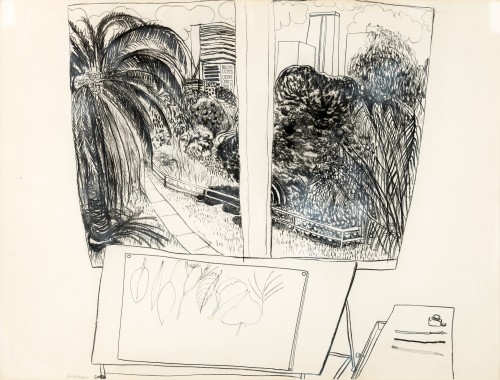 Essentially addressing the nature and process of drawing the landscape en plein air, Park from the Window, Lavender Bay presents a continuation of Whiteley’s Fijian quest for contemplative peace within the (tropical) landscape. Now, Whiteley, in an homage to Matisse, was recording these stunning views looking out from calm interior of his own home. Park from the Window relates to major paintings as Park Under Sunlight, 1976, in the collection of the National Gallery of Victoria and prefigures his popular editioned prints of 1978 – 1980, such as Orange Fruit Dove in Clark Park and Garden in Sanur (Bali), in which variegated leaves are fanned out in the foreground of a landscape view.