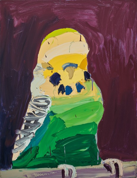 Fittingly, Quilty’s budgies were conceived as portraits of real-life human subjects, captured in ‘mug-shot style’.5 In PAT, 2004 the blocky form is built up of slabs of green and gold paint, trowelled onto the surface of the canvas in sweeping, confident arcs. Although at rest and clearly clinging to his perch, the possibility of flight (and escape?) is captured in the zig zag-like marks on the bird’s wing, creating an uneasy tension between repose and animation. The painting exudes a love of the medium of paint and the act of painting, best summed up by the artist himself: ‘For me the most exciting thing is that incredible energy that comes about when you start to try and find something new. And painting, the whole act of it – putting one tiny, tiny, tiny bit of colour into this huge, big expansive mass of thick paint can be an incredible feeling and can leave me for a week on a high.’6