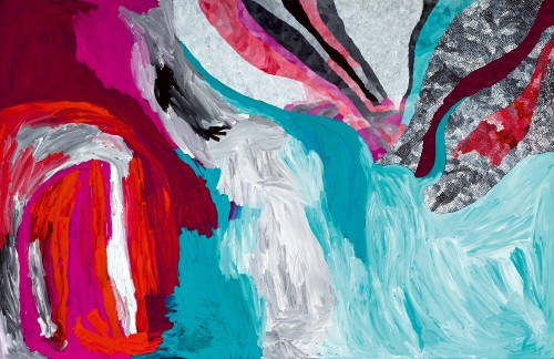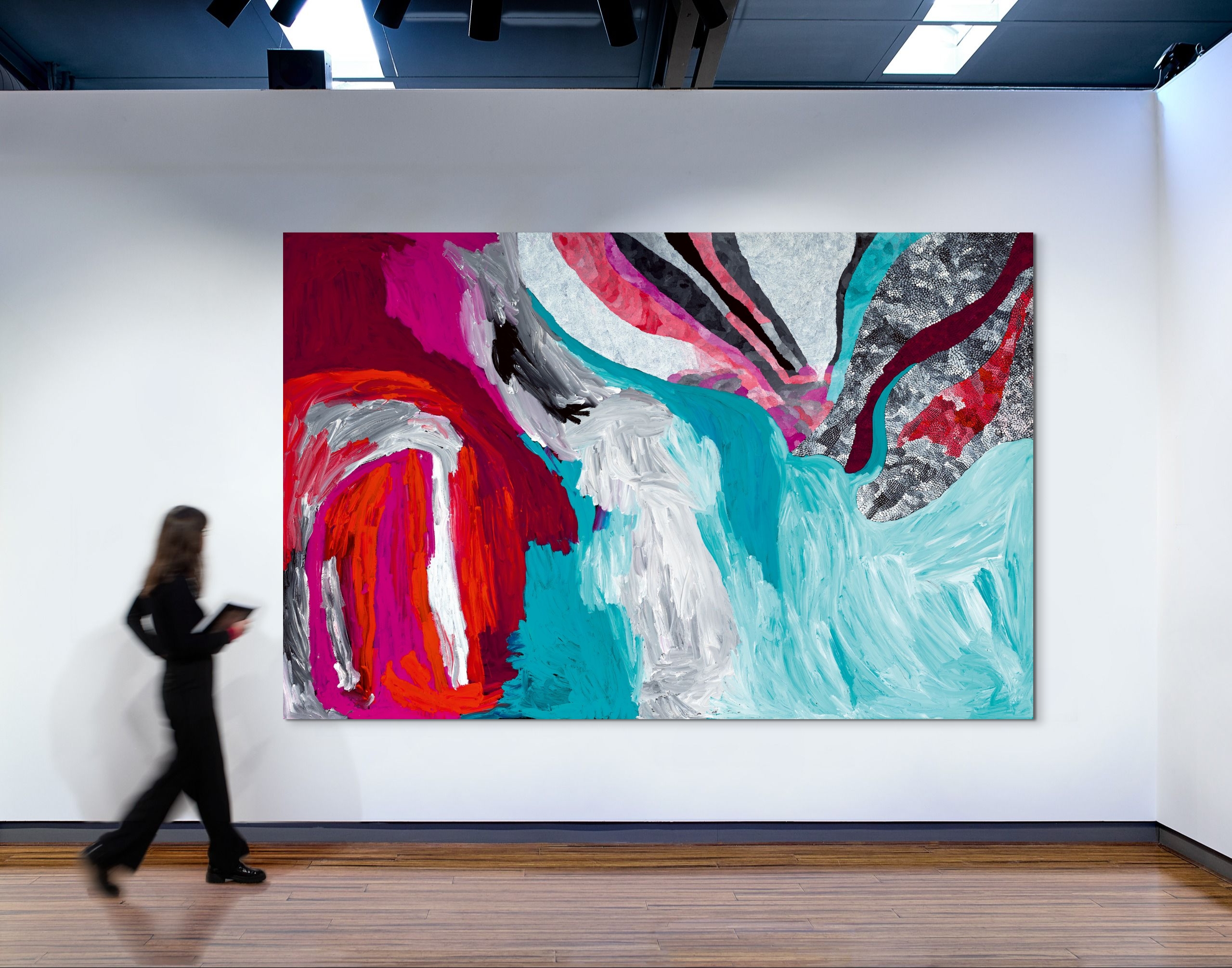 Known also as Dibirdibi, this was Pat Gabori’s totemic country with inherited responsibility for the stories and associated places. For Sally and her daughters, these ancestor stories and personal history overlap. Paintings of Dibirdibi depict inland estuarine saltpans, mangrove swamps, rivers, reefs, rock-walled fish traps and hunting grounds that provided an extraordinarily rich set of places with personal and cultural association, providing Sally and her daughters with a wealth of creative inspiration. Whilst much of this major painting contains the varied colours and strong gestural mark-making of Sally Gabori, both Amanda and Elsie, who also had inherited the Dibirdibi totem after Pat’s death, have depicted their personal interpretation of their father’s country. Bands of white, red, purple black and grey colours, painted by Elsie Gabori, sweep down from the central top edge and mimic the variations of the land. Amanda, meanwhile, in the top right hand corner of the canvas, records the delicate scales of the ancient Rock Cod. For both mother and daughters, this canvas is an expression of the love and memory for a husband, father and the landscape of their country, sung in unison.