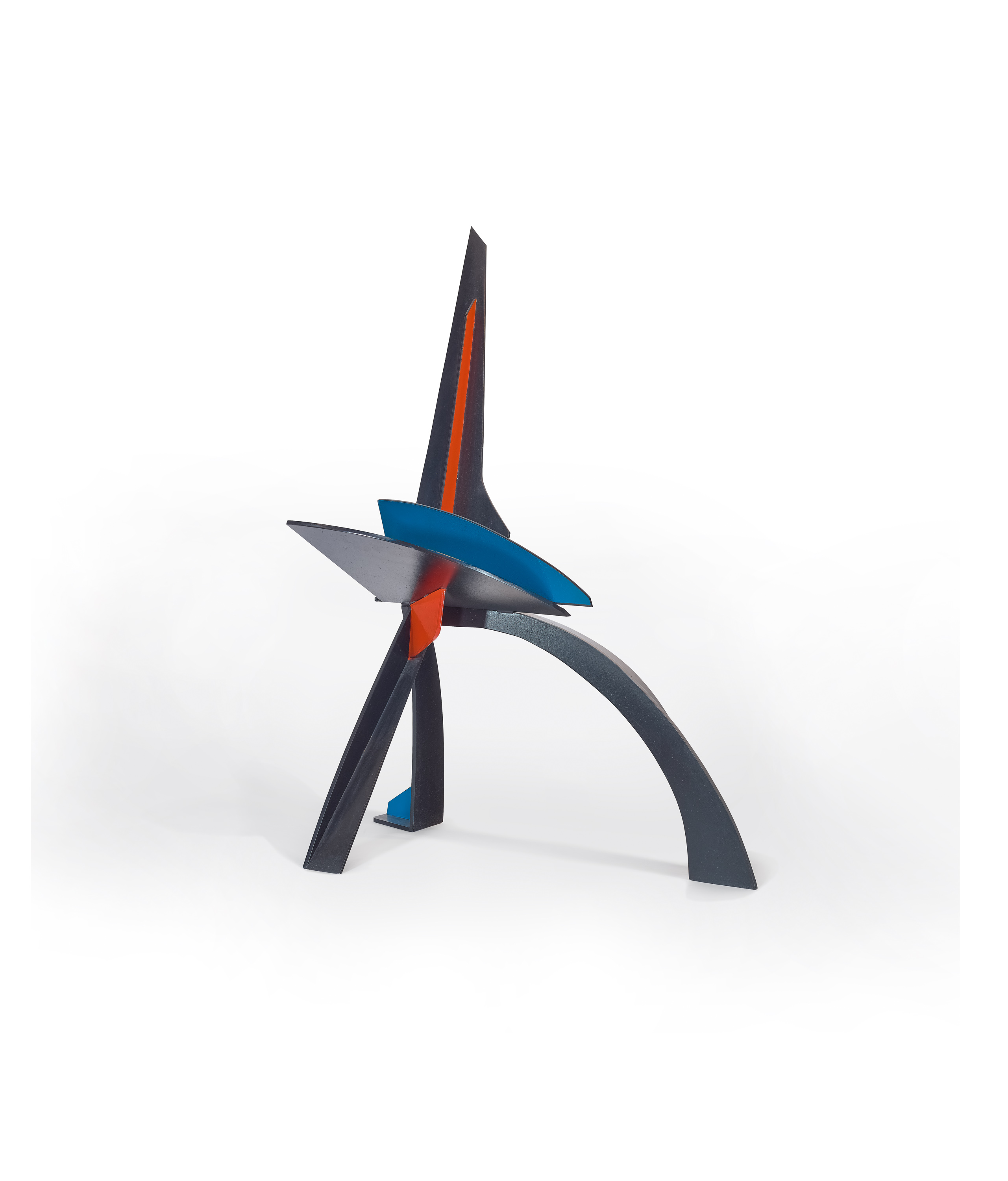 King’s mature work Pegasus of 1991, created at the age of seventy-six, has a direct provenance and its unusual “windvane-like” format points to its extended sculptural significance. The visually striking steel sculpture has a beacon-like structure that uses a tripod base to support a series of forms suggesting the elongated mass of a body with an outstretched set of wings. The whole sits aloft a peak whose triangular outline is suggested by three large arcs. If the sculpture’s title is any guide the abstracted upper section of the sculpture may point to a link with the Greek myth of Pegasus, the winged horse upon the mountain of Helicon, a subject much favoured by the French artist Odilon Redon (1840-1916). Whatever the original ideational source, the sculpture’s three-dimensional format of held-aloft shapes atop a tripod base points to King’s later desire to “animate” and add “lift” to her sculptures during the early years of 2000, as exemplified by her contemporaneous Angel and Dance Series. If this is the credible case, the formal elements together with the arrested dynamism and gestalt of King’s Pegasus of 1991 may be seen as related to the overall “visual language” of Sentinel of 2000, her earlier and much-admired monumental commission (13 metres) for Melbourne’s EastLink Freeway.