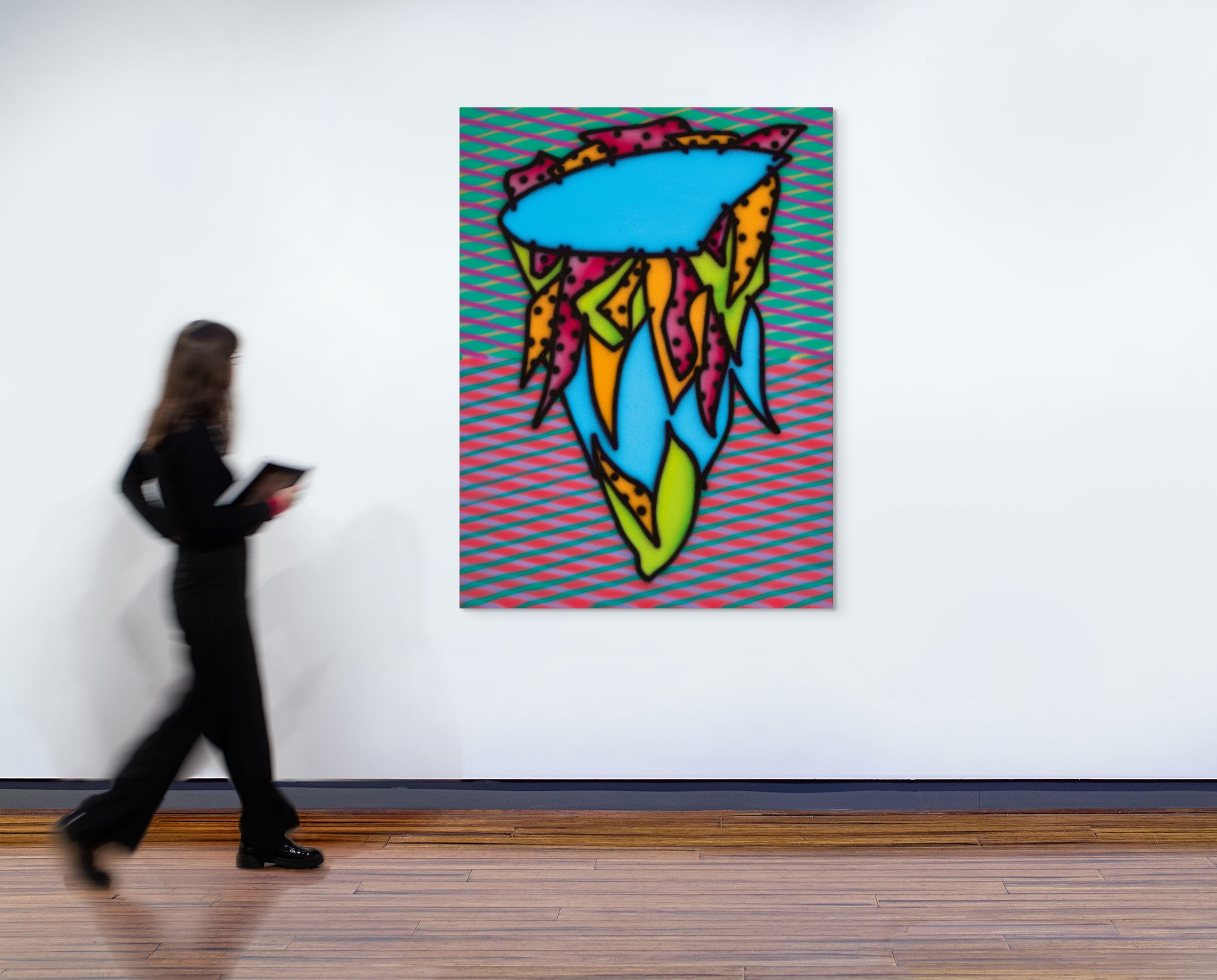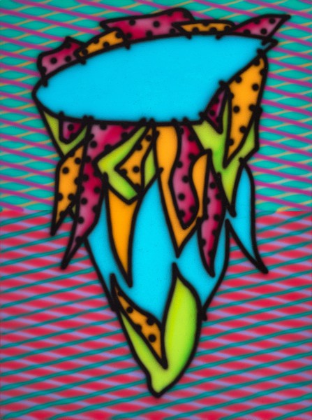 While the work’s title refers to the capacity to determine a subject’s personality or character through their facial features, Arkley’s teardrop shaped ‘head’ remains blank, revealing nothing. This impenetrable visage, with its areas of rich block colour and dotted hairlike tendrils become the perfect foil for the shifting chromatic spectrum of Arkley’s complex crisscross background and black spray outline, which seem to physically pulse, and always hover, on the edge of focus. Drawing upon the imaginative lineage of Surrealism and Pop, Arkley often replaced the human head with a cactus in his drawings, and in turn, his first major portraits – Tattooed Head, 1983 (Collection TarraWarra Museum of Art) and Zappo Head, 1987 (Bendigo Art Gallery) – included several plant-like features.3 Over time, these cactus heads became ‘something of a signature for the artist’s persona – another alter ego and mask’.4 As Arkley’s wife and long-term assistant, Alison Burton has recalled: