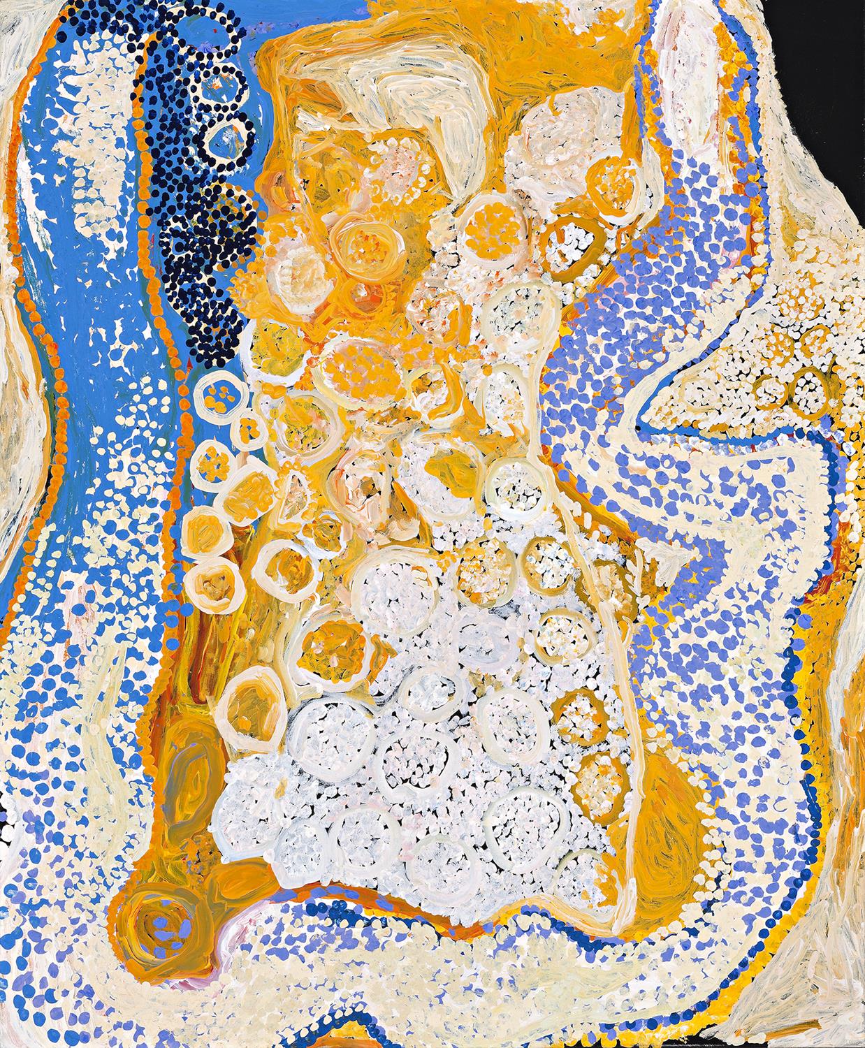 This painting is accompanied by a certificate of authenticity from Tjungu Palya Arts that states: ‘This is the true story of those two women from Piltati. They were digging for a big kuniya (carpet python) that was really wati kutjara (two men). While the men were underground they were painting. The women kept digging and hit the kuniya with their wana (digging stick) then the wanampi rose from the hole and ate the women.’