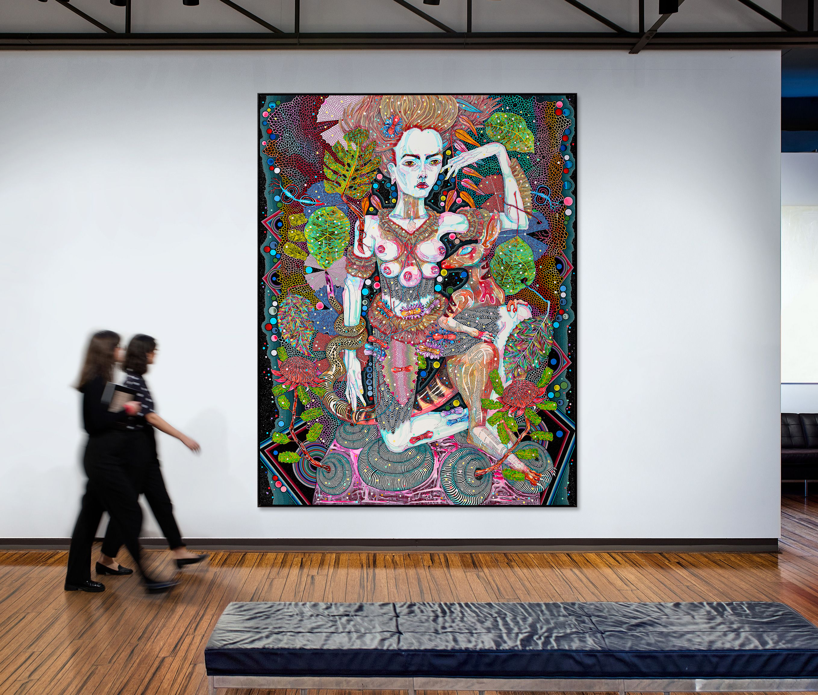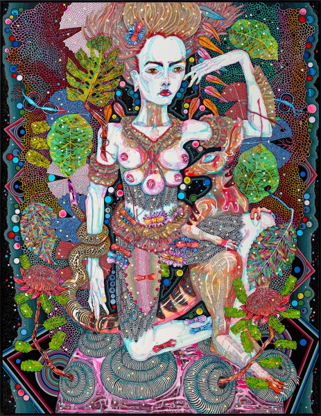 Much of Barton’s work displays interlocking organic systems and metamorphic beings. She bedecks her surfaces with carefully drawn details inspired from her childhood in the Australian bush, from the feathered armbands of the goddess and bristled fur of her companion to the purely abstract radiating concentric circles and chevrons that frame the scene and coalesce around her body like an aura. A celestial and cosmological being, this goddess towers over her translucent globe. Evoking the whimsical tiny asteroid home of the Little Prince, this orb is more than just a pedestal. Veins of bright blue and scarlet snake out from its core to pierce her body and entwine her torso, nourishing her and creating a symbiotic relationship between her body and the broader environment. In this scene, the wallaby, with a glassy eye and head turned towards the goddess’ chest as if to suckle, appears to transform into a striped and spotted snake wound around her opposite arm. Barton’s layered painted surface is slick and polished. The disparate elements of this astonishing being and her attributes are tied together through repeated decorative details covering the canvas support. Large leaves flutter behind and in front of her figure, their green and blue kaleidoscopic surfaces salient against a palette dominated by contrasting pink and orange. While the willowy forms of her protagonist quotes the figurative work of Egon Schiele, symbolist myths and High Renaissance portraiture, the dense, all-over patterning echoes the delicate dotted nets of contemporary female artists Yayoi Kusama, Emily Kngwarreye and Angelina Pwerle.