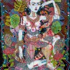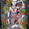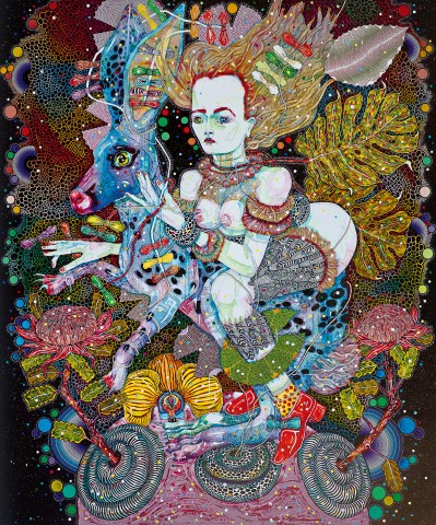 A towering altarpiece to a mysterious chimeric goddess, Del Kathryn Barton’s Of Pink Planets, 2014 seduces with dazzling colours and a lavish cornucopia of minute decorative details which densely cover the painting’s surface. Painted in the centre of a symmetrical radiating mandala, she is depicted amongst whimsical boughs and garlands like a holy icon of organic origins. Although she is flanked by flora and fauna identifiably Antipodean, Barton’s female deity inhabits a different universe. Kneeling atop the eponymous pink planet, she travels through a starry psychedelic void, her wallaby-faced companion clinging to her feathered thigh. Yet, for all of these eye-catching details, the subject of this painting appears resolute and unemotional, gazing imperiously through us towards an unknowable future.