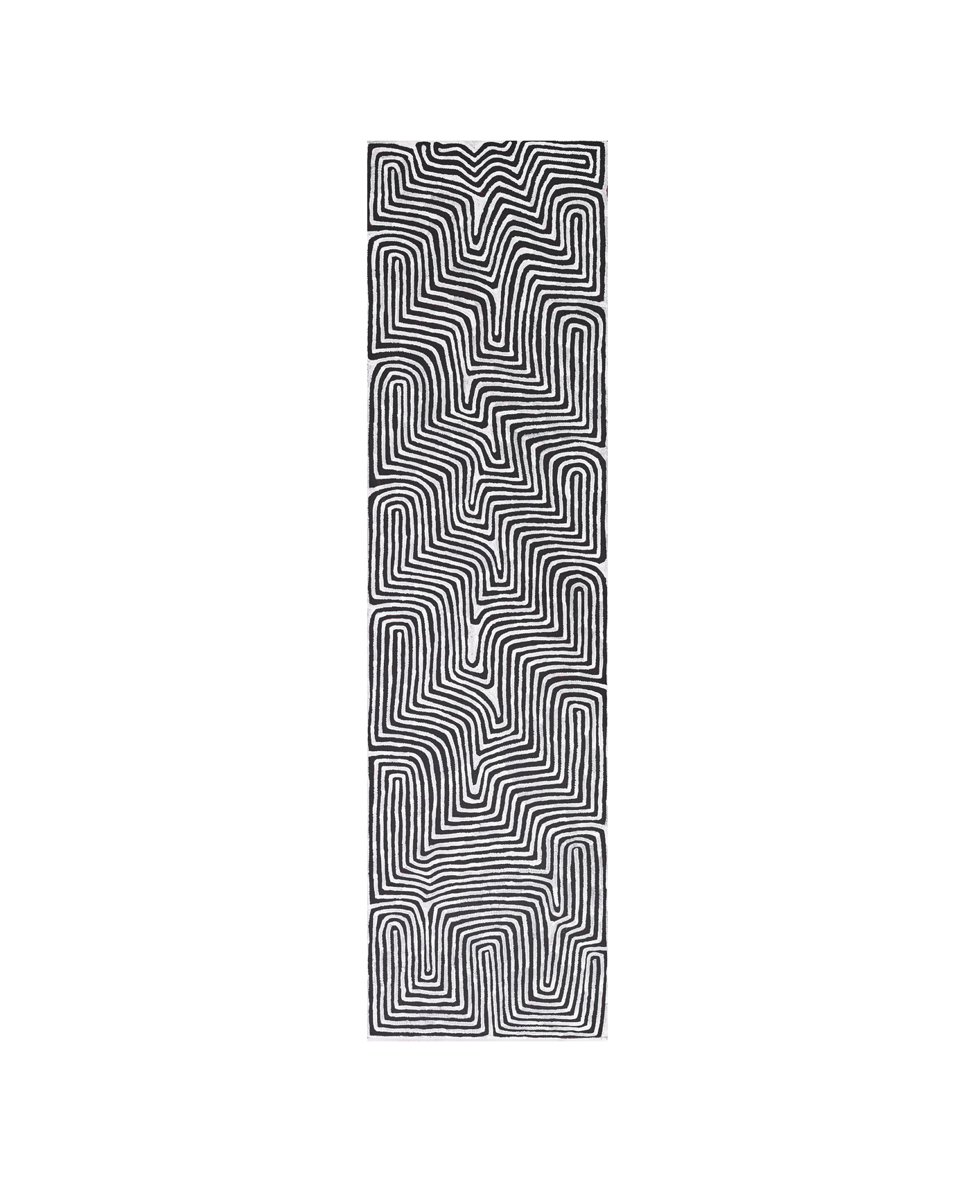 This work is accompanied by a certificate of authenticity from Papunya Tula Artists, Alice Springs which states: ‘This painting depicts designs associated with the site of Piwalku, a large swampy area with soakage water, on the eastern side of Lake Mackay. In mythological times a Snake Ancestor came to this site from Karrinyarra (Mt. Wedge) in the east. On arriving at Piwalku it went underground. This mythology forms part of the Tingari Cycle. Since events associated with the Tingari Cycle are of a secret nature no further detail was given. Generally, the Tingari are a group of mythical characters of the Dreaming who travelled over vast stretches of the country, performing rituals and creating and shaping particular sites. The Tingari Men were usually followed by Tingari Women and accompanies by novices and their travels and adventures are enshrined in a number of song cycles. These mythologies from part of the teachings of the post initiatory youths today as well as providing explanations for contemporary customs.’
