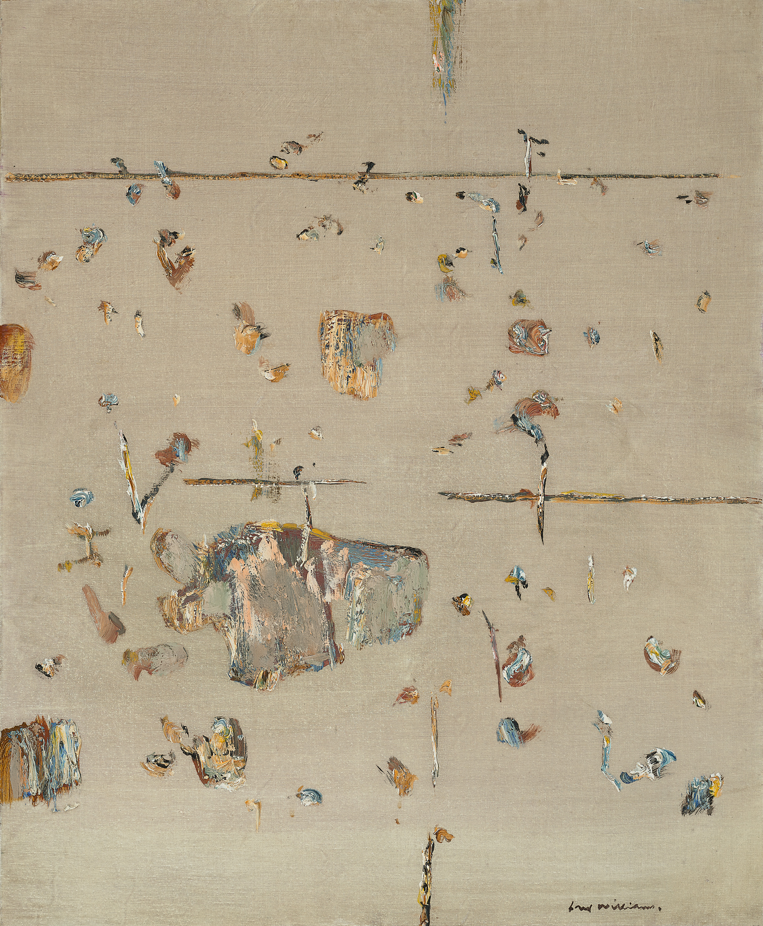 With its predominance of cool tones, Ponds, Lysterfield evokes winter. The scrubby but empty countryside is created by a few impasto strokes of the brush across a smooth field of velvety greys. These expressionist textures also contrast against the balance achieved through the accent on verticals and horizontals, and the classical association they give to the composition. A masterpiece of minimalism, the absence of a horizon line achieves greater harmony, earth and sky are one, supported by the multi-viewpoint and its combination of motifs seen from above and in profile. His art is ‘both intimate and remote’ wrote Elwyn Lynn in The Bulletin of Williams’ 1966 exhibition’.4 Williams’ remote intimacy is almost Chinese in its mixture of immediate gesture, of spontaneous notation, with contemplation and serenity’, he continued. In Ponds, Lysterfield the landscape provided Williams with the inspiration for a singular, lyrical essay on the Australian scene in all its casual formality. It is a painting of ineffable beauty.