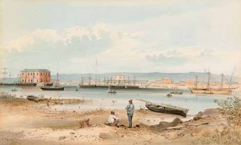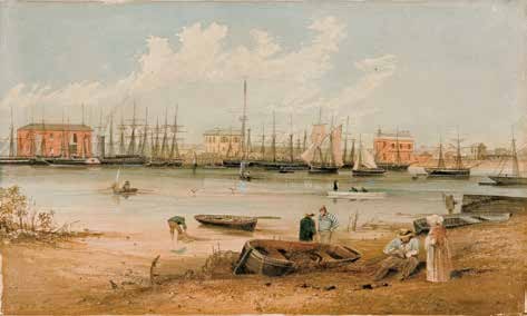 Gill is well known for returning in his later years to earlier scenes and events, as with his series recalling life on the goldfields commissioned by the Melbourne Public Library (now State Library Victoria) in 1869, or episodes from the ill-fated Horrocks Expedition of 1846. Port Adelaide, however, was one location that he captured in multiple watercolours in a short period of time, evidence of this vital infrastructure for exporting the proceeds of its new produce, agricultural and mineral industries. With the emergence of this wonderful watercolour from institutional storage, four finished watercolours of this outlook on the banks of Gawler’s Reach are now known (two in the Art Gallery of South Australia; National Library of Australia), plus further studies.2 Another earlier version (presumably one of Allen’s) remains unlocated, the source of the watercolour painted in London by English artist-copyist Thomas Hosmer Shepherd (now Art Gallery of South Australia), and also for the hand-coloured lithograph in George French Angas’ South Australia Illustrated, published in London in 1847. Views by Gill from the other side of the river are also known in multiples.3