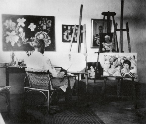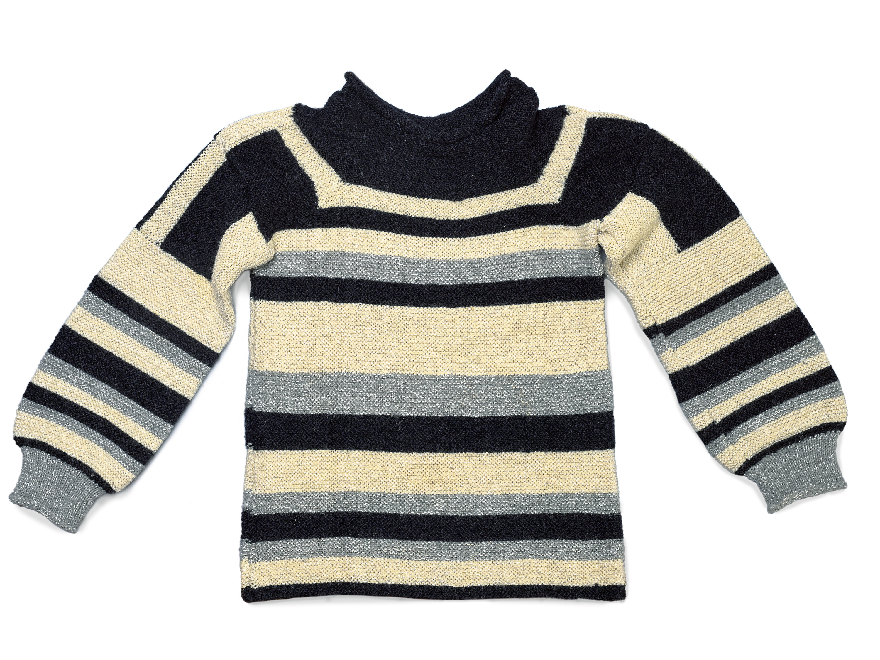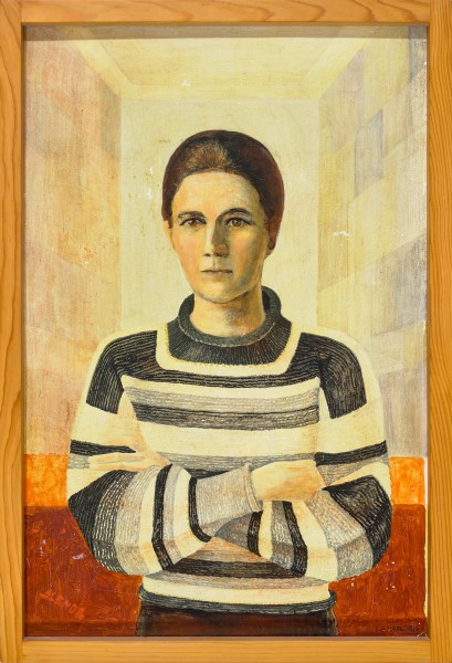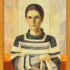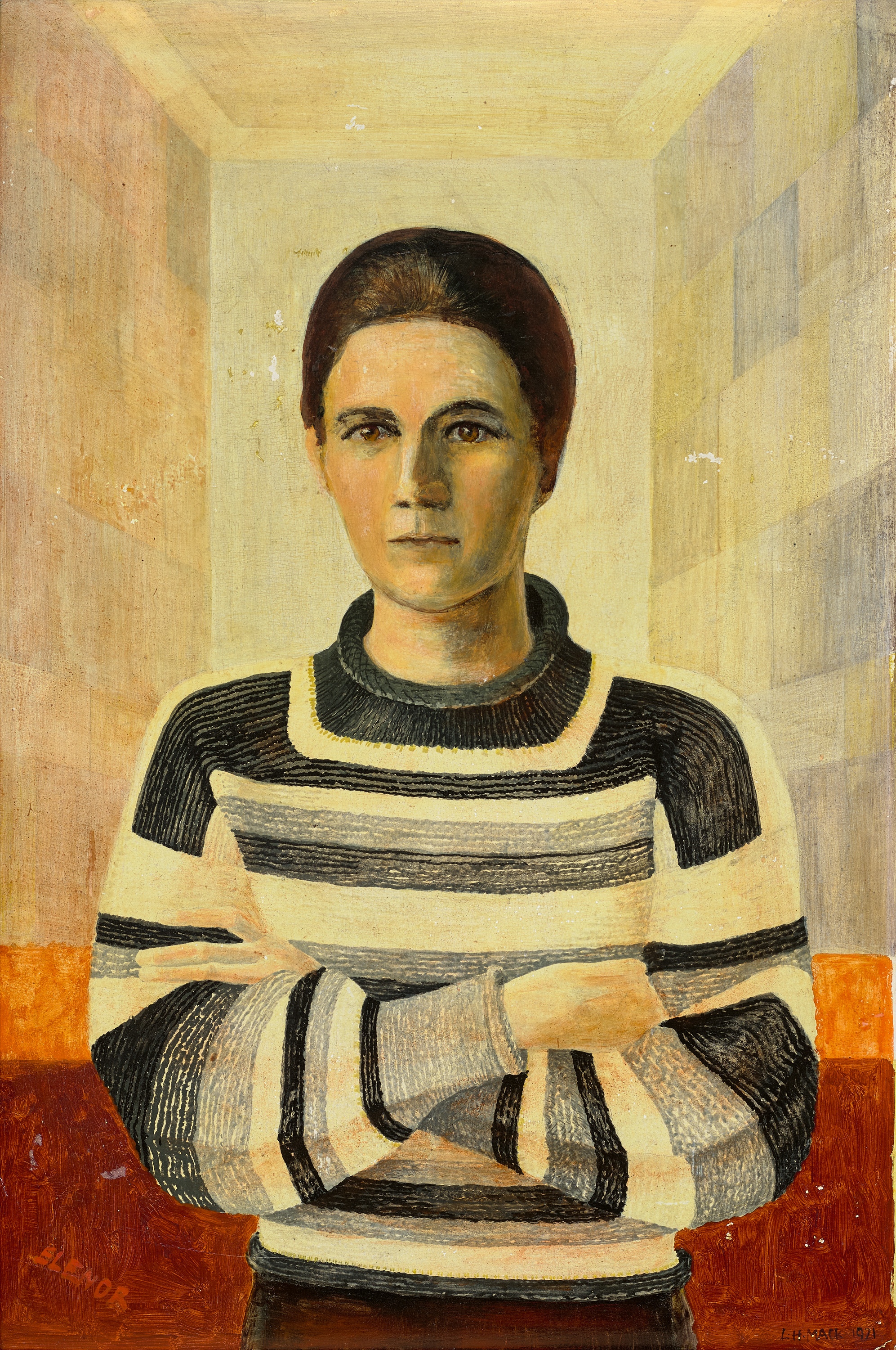 Painted in oil on cardboard, the portrait describes Elenor’s appearance, as well as capturing something of her attitude and personality. Looking straight ahead and with arms folded in front of her body, she appears confident and purposeful, a modern twentieth-century woman. Her boldly patterned jumper, which was knitted by Elenor herself – has been retained by the family and accompanies the painting in this sale – is prominent within the picture and although Hirschfeld-Mack has paid attention to describing its texture, it is surely the graphic potential of the knitted bands of colour which most appealed to his artistic eye. While Elenor occupies a strangely compressed interior space, the focus is firmly on her image. The theme of geometric abstraction that Elenor’s jumper introduces to the composition continues however, in the background of the painting where delicately painted grids of pale, almost translucent colour adorn both side walls. It has been suggested that these patterns represent weaving designs which Elenor made in the Bauhaus workshops, but whatever their source, their presence here reminds us of Hirschfeld-Mack’s parallel interest in realism and abstraction and his ability to create images in both modes which combine strong visual design with a characteristically humanist motivation and intent.