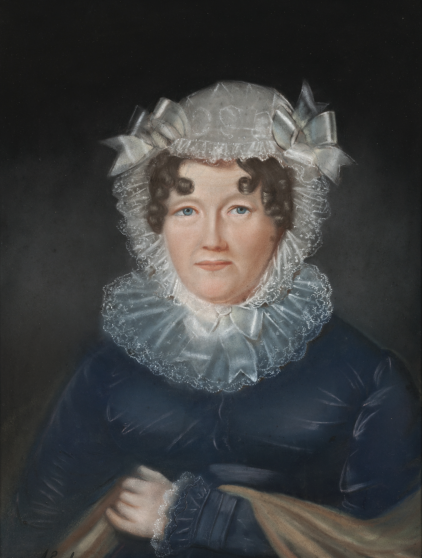 Given the uniqueness of the present work, it is instructive to compare Earle’s deployment of the medium with his watercolour technique. The watercolours follow the common late Georgian fashion, with landscape forms described through broad, floating planes of tone, (somewhat in the manner of Thomas Girtin, or rather Francis Towne),8 and faces by the kind of stipple-hatching of the miniaturist on ivory.9 Here, however, Earle works in the opposite manner to that of a watercolourist, by accumulation rather than separation of pigment, by smooth tonal gradation rather than touches of colour. Furthermore, rather than leaving the support blank (or using a water-resistant ‘stopping out’ varnish, or ‘scratching out’ with a nib or knife) and having the white of the paper flash edges and reflections, linen and water, the artist here adds his highest tone at the end of the process, giving to Mrs Barnes’ aureole of white lace and ribbon the space and form of clouds. Augustus Earle was clearly as comfortable with coloured chalks as with watercolour or oil paint; Mrs Barnes' pink face is delicately, flatteringly modelled (she was 41 at the time the portrait was taken), and the shimmer and translucency of the white collar and cap which frame her visage are particularly deftly executed, in broad, confident strokes, subtly layered and delicately stippled.10 The work is in very fine condition, in its original frame and glass.