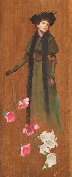 A noted painter of portraits, Ashton’s works range from Portrait of Louis Buvelot, 1880 (Geelong Gallery), through to Spring (Miss Helen Willis), c.1889 (National Gallery of Australia). The stylish (Portrait of a Lady), c.1890s, like its companion piece, Young Woman with a Parasol, 1895, is modish of dress.1 The folded parasol held by the latter, however, has morphed into the red and white azaleas of the former. Appropriately, azaleas in all their beauty symbolise femininity and softness. Such floral additions and detailing are a particularly attractive feature of Ashton’s portraits of ladies. Also, he often shows them in profile, facing right. Touched by a French sophistication and elegance inherited from his student days in Paris, their immediacy of appeal is promoted by the direct application of paint onto the unprimed cedar panel. Another striking feature of these related works is the presentation of the figure from a lower viewpoint – visually arresting through elevation. While the question of the identity of the model for (Portrait of a Lady) has not been resolved, Ashton’s daughter Bertha is a possibility. Although young, a likeness can be found in the drawing, ‘female head’ on the verso of ‘(Bertha Ashton)’, in the Ashton sketchbook in the National Gallery of Australia. 2