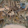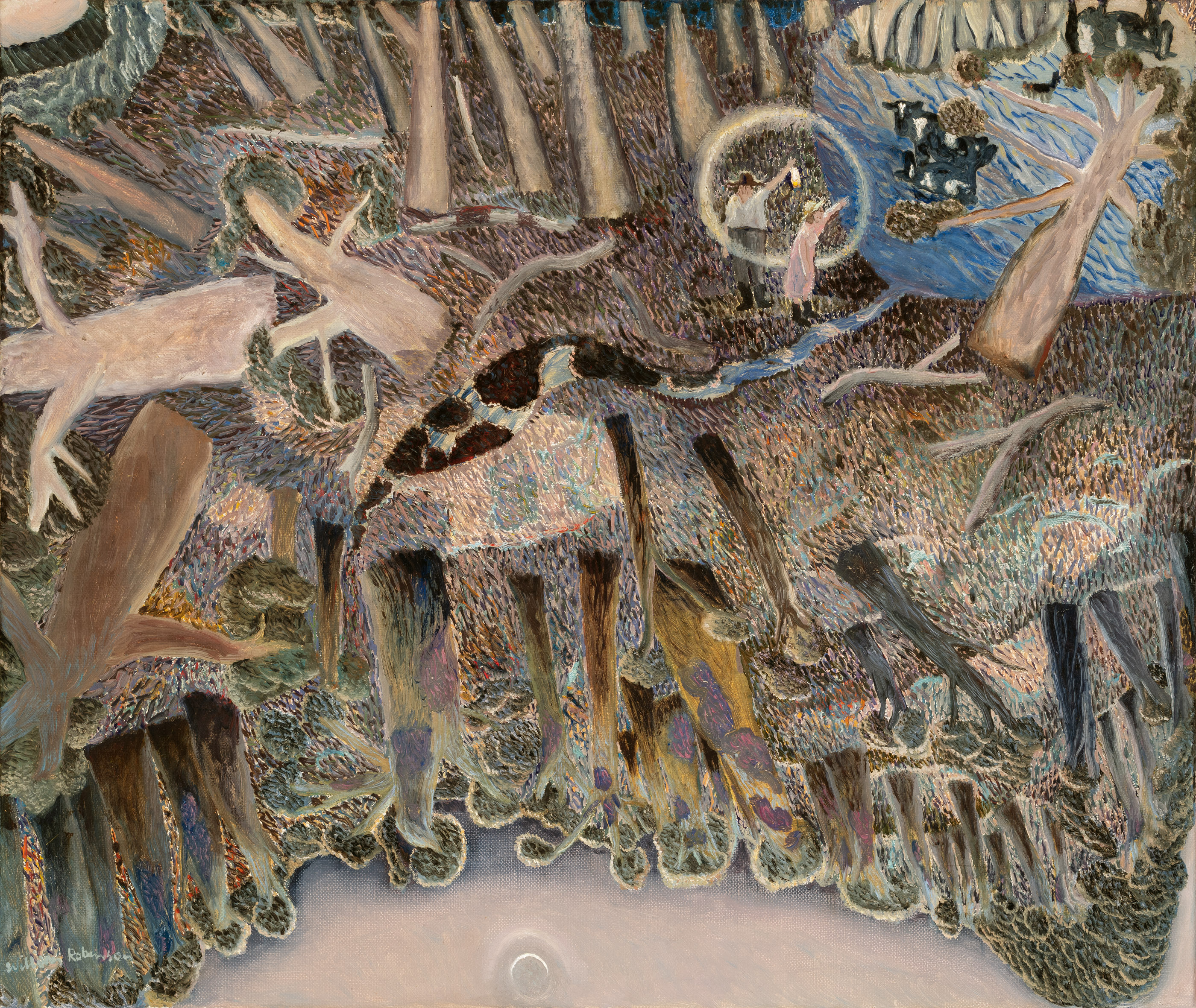 Late evening is suggested by Bill holding his kerosene lamp with its halo of light echoing the crescent moon setting low in the west. And what of the Possum which features so prominently in the title of the work? It makes the most minor cameo appearance in the upper right of the work near Bill, Shirley and the cows. The mention of possum points to Robinson’s arial views, suggesting that perhaps we are viewing the landscape from high in the trees looking downward as the possum does. So while the image of the possum is tiny, its importance to the work is overarching.