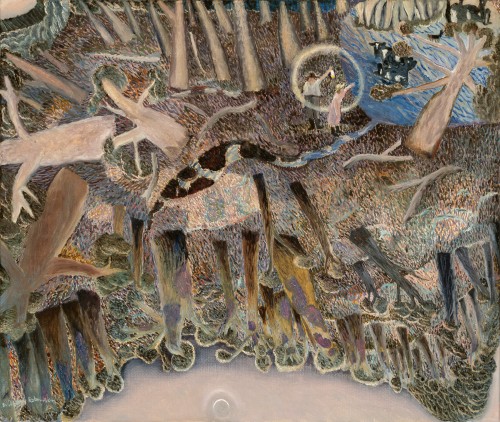 When Possum Moon Landscape was painted, Bill and Shirley Robinson were living on two hundred acres of bush, rainforest and cliffs at Beechmont in southern Queensland, where they had moved to in 1984. The works from around this time can be viewed as autobiographical vignettes often containing playful anecdotes about Bill and Shirley’s life on the farm.