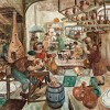 The Pottery belongs to an important cycle of Perceval’s paintings which display the influence of his close study of works by Rembrandt, Brueghel and Hogarth. Earlier, Albert Tucker had introduced him to an influential book on painterly technique5 and through this, Perceval developed a personalised ‘mixed media technique of resinous colour over tempera with a heightening of white, allowing a calligraphic basic drawing and a rather dry scumbled top effect’,6 an approach which is evident in this work. The Pottery and four associated drawings were exhibited in 1948 in the artist’s first solo exhibition at the Melbourne Book Club Gallery, an event which also featured paintings of biblical stories set within Melbourne locations, alongside bucolic scenes drawn from the artist’s intimate Murrumbeena environment. Many of these are now considered major works from the artist’s oeuvre including French Nuns, The Ark, Xmas Eve, The Bar, The Market and the tender Flight to Egypt, now in the collection of the Art Gallery of Western Australia.