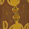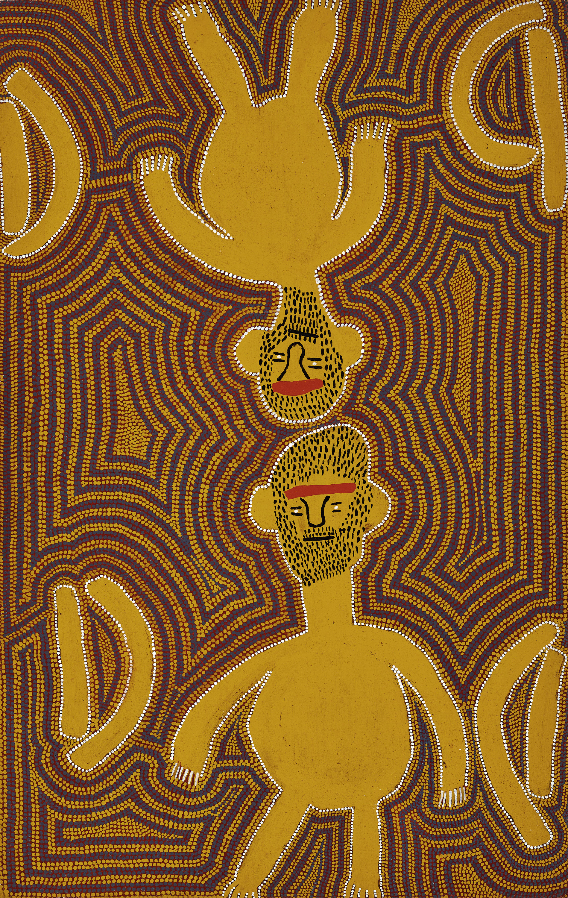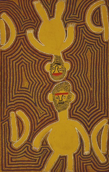 This work painted 1983, is a rendition of the Punkalungku, mythical men who lived in a large cave in the hills near Papunya and who frightens and punishes lawbreakers. Painted on a black ground, the repeated figure of the giant framed by alternating broad bands of red and yellow ochre creates a minimal repetitious template typical of the artist’s work at this time.