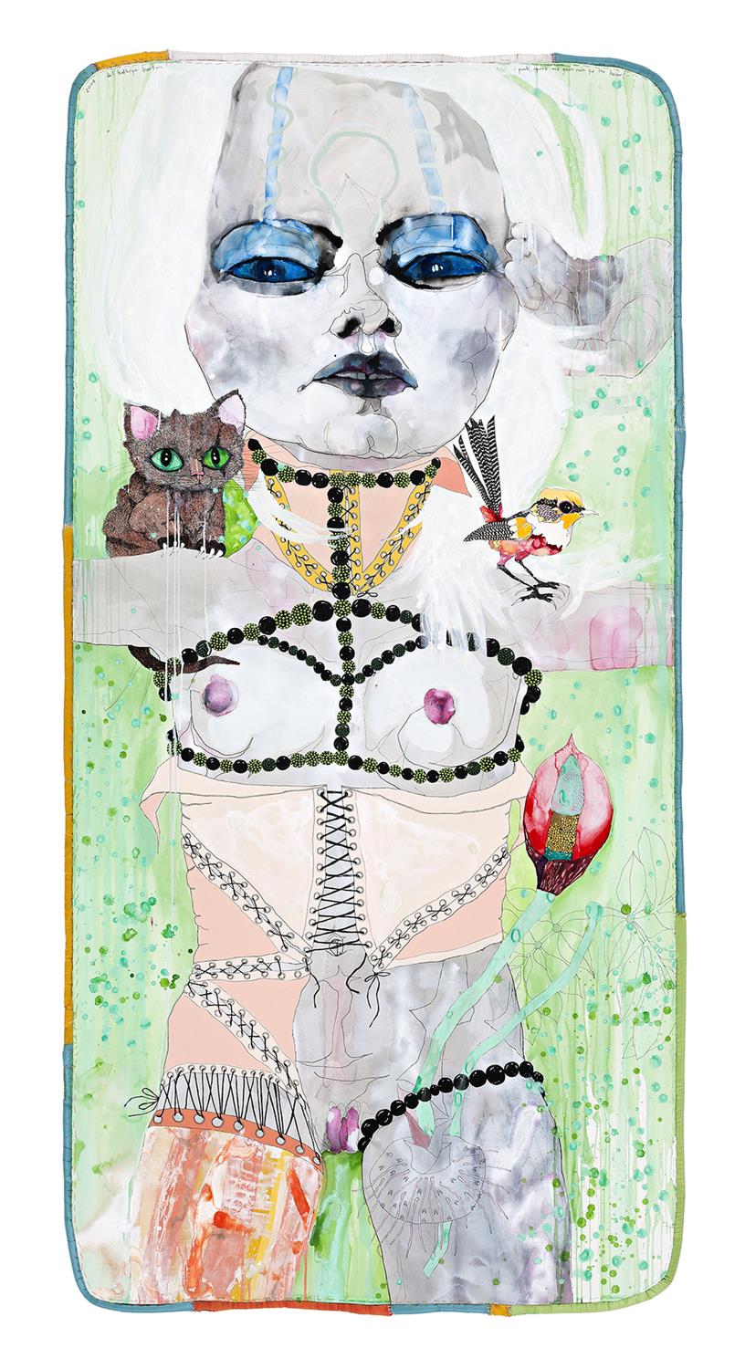 Betraying a myriad of artistic influences from the fine nude drawings of Egon Schiele to the eroticised poupees of Surrealist Hans Bellmer, Del Kathryn Barton’s richly embellished works offer a complex, often disorienting meditation upon the dichotomous nature of beauty. By highlighting both the sensual and abject dimensions of beauty, she seeks to undermine simplistic notions of the feminine. Not surprisingly perhaps, Barton also references the contradictions inherent in society's celebration of female beauty through the shallow space of fashion – its collapse of life into a pose and collapse of character into a decorative appearance. For all their contemporary allusions however, Barton's lithe figures also seem strangely of another time – their big, overstated eyes recalling the feminine vapid, doe-eyed cuteness in post-war Japanese manga or the unearthly gaze often found in naive art.1