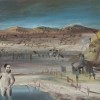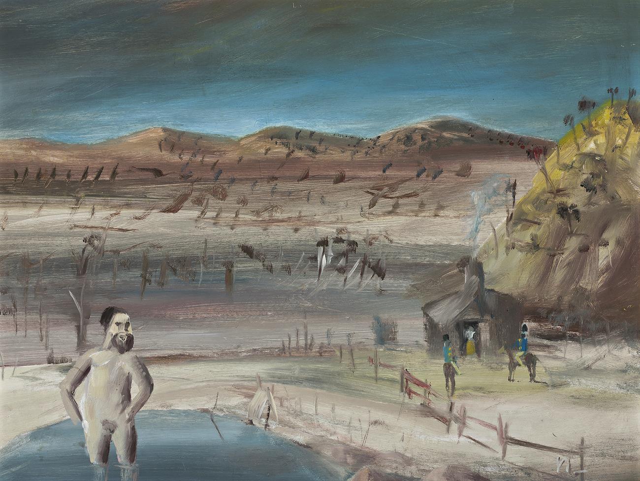 Nolan embarked on a second major series of Kelly paintings in the mid-1950s, by which time he had settled in England. The theme had lost none of its power during the preceding decade and Nolan produced an inspired body of work that showed him as a confident and accomplished artist. Painted in February 1954, The Questioning (Kelly Series), 1954 describes the same event as the 1947 version – when mounted troopers calling at a homestead during their search for the Kelly gang are directed to ask a figure bathing in a nearby dam – but Nolan has made various subtle changes which shift the emphasis of this painting and imbue it with a quiet intensity. The horizon line has been raised so that it is the landscape of scrubby growth and distant low hills that dominates the composition. The ominous grey sky reflected in the dam establishes the prevailing mood and the country between is described in a restrained palette of earthy colours deftly applied to the board with lively strokes of the brush. The bright yellow Ripolin which draws attention to the bathing figure and the mounted troopers in the earlier version is nowhere to be seen and rather than the human drama being the key focus, it is the relationship between the figures and their environment that emerges as most significant.