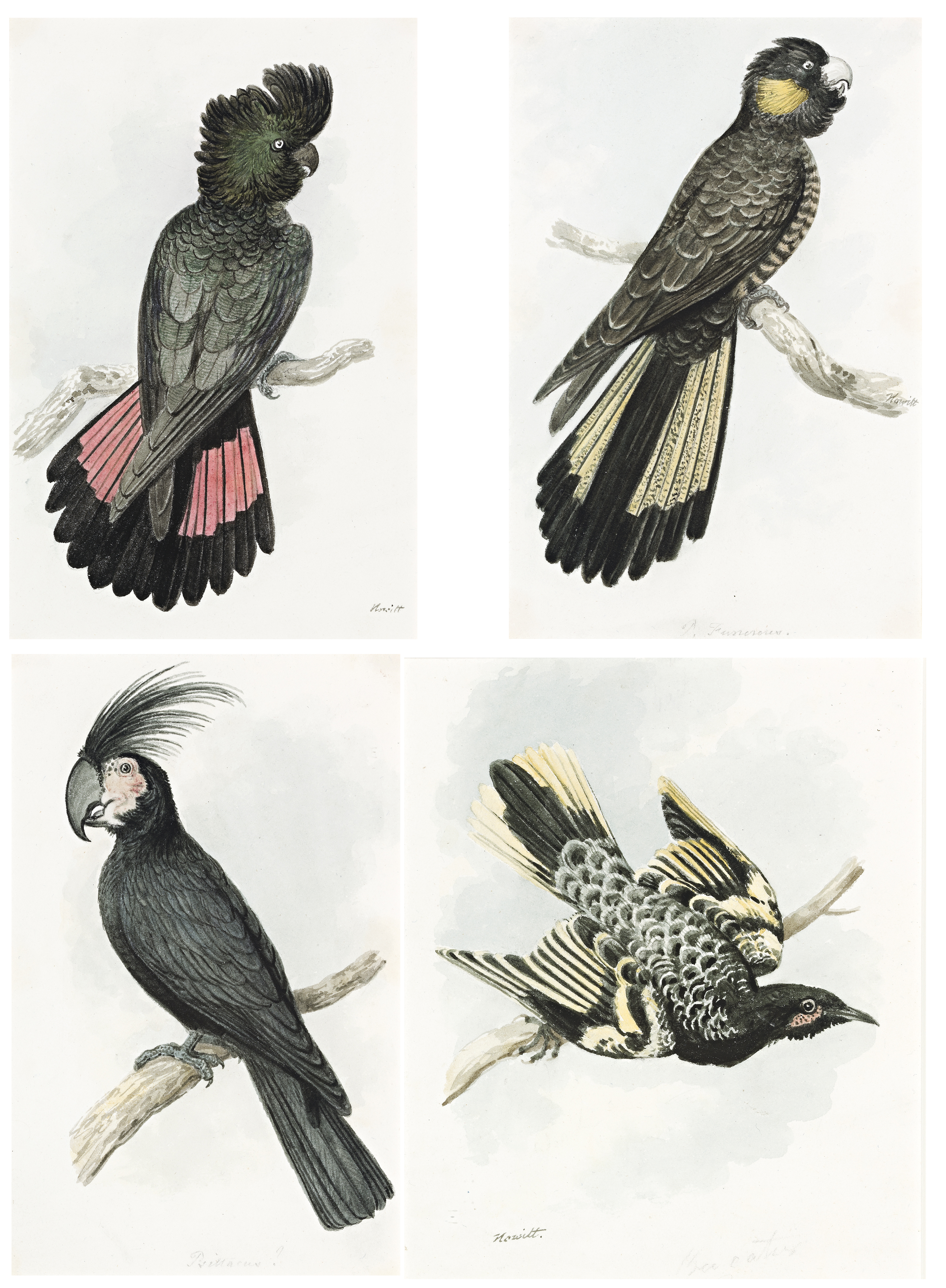 Howitt was recognised for his lively and accurate depictions of natural history specimens and this is well demonstrated in the four works presented here. The four birds Howitt has illustrated, the Red-Tailed Black Cockatoo, Yellow-Tailed Black Cockatoo, Palm Cockatoo and Regent Honeyeater are now all considered to be endangered species.