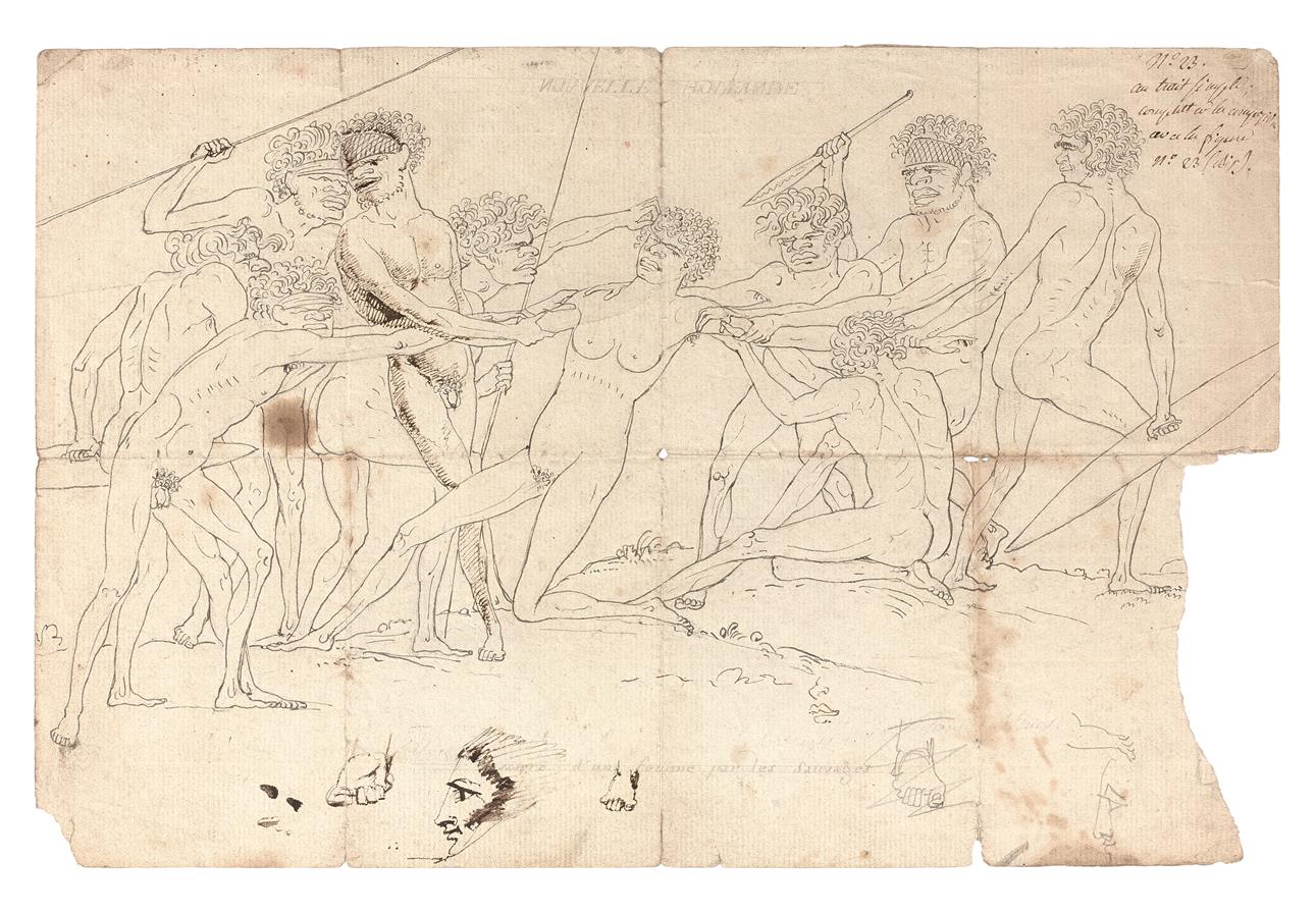 The second preliminary sketch relating to the “Port-Jackson, Nlle. Hollande: cérémonie préliminaire d’un mariage, chez les sauvages”, plate 104 in the Freycinet atlas of 1825.