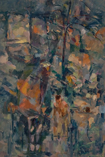 In The Red Rock, 1951, the push and pull of the warm and cool colours create lush, deep, space that recedes to the distant upper left and draws forward toward the lower frontal third of the work. The two figures bathe carefree in an Idyllic surround. The reflective surface of the water proves to be a helpful pictorial device, allowing the artist to further fragment the light. Daubs of colour are used to pick out the figures, just enough to reward and satisfy the viewer’s scrutiny and need of subject, but once discovered the figures again dissolve into pockets of vibrant local colour. Passmore’s works from this period are some of the most complete paintings of his career. The painted surfaces are worked and reworked until they reach a finely tuned crescendo that quiver with nuance and feel. Passmore wore his influences on his sleeve and The Red Rock, 1951, is an excellent example of John Passmore via Cézanne and Keith Vaughan. At a stretch, we could consider a cameo of Rembrandt’s A Woman Bathing in a Stream, c.1654, for these are studio works and such references are entirely appropriate and legitimate.