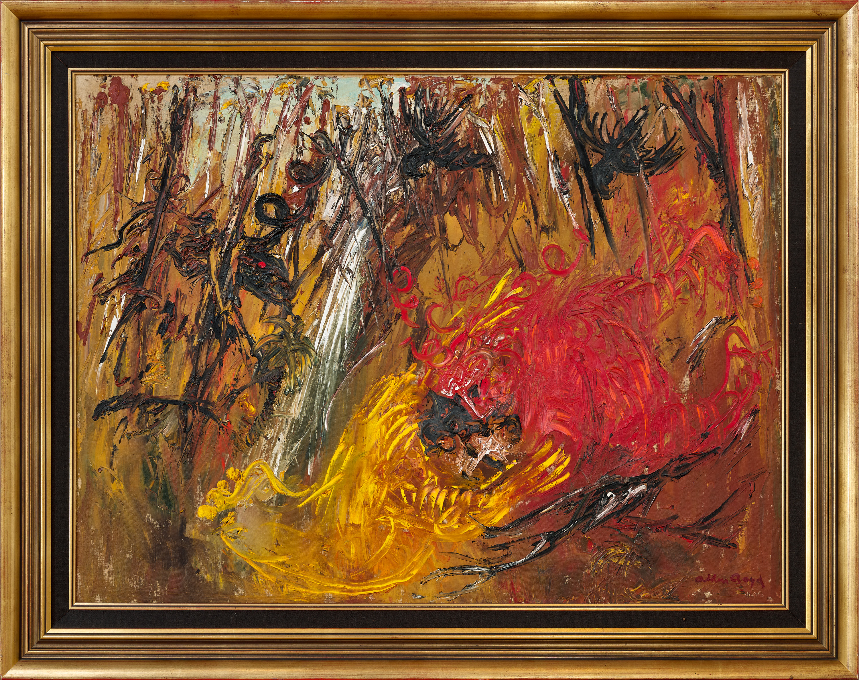 Of particular relevance are Boyd’s depictions of Nebuchadnezzar which vividly evoke the descent of the King of Babylon’s descent into madness – witness for example, Nebuchadnezzar Running in a Forest with Lion and Black Birds which bears affinities with the present work in its overall composition of dense shrubland, the abstract fusion of figurative elements with natural surrounds, and inclusion of motifs such as the curly-horned ram, ominous black birds and the figure in red.3 Moreover, as in the Nebuchadnezzar series, here the bush similarly becomes a site of intense psychological anxiety, a space of moral degeneration and fall from grace. With its litany of personal symbols, interconnection of elements and energetic handling, thus Return of the Prodigal Son, c.1968 exemplifies superbly Boyd’s singular talent for capturing man, beast and nature caught up in the same expressive maelstrom of strange and malevolent energies. Like the most successful of his biblical narratives, the composition abandons logic to invoke a mythic, spiritual dimension and enigmatic resonance that far transcends pure representation.
