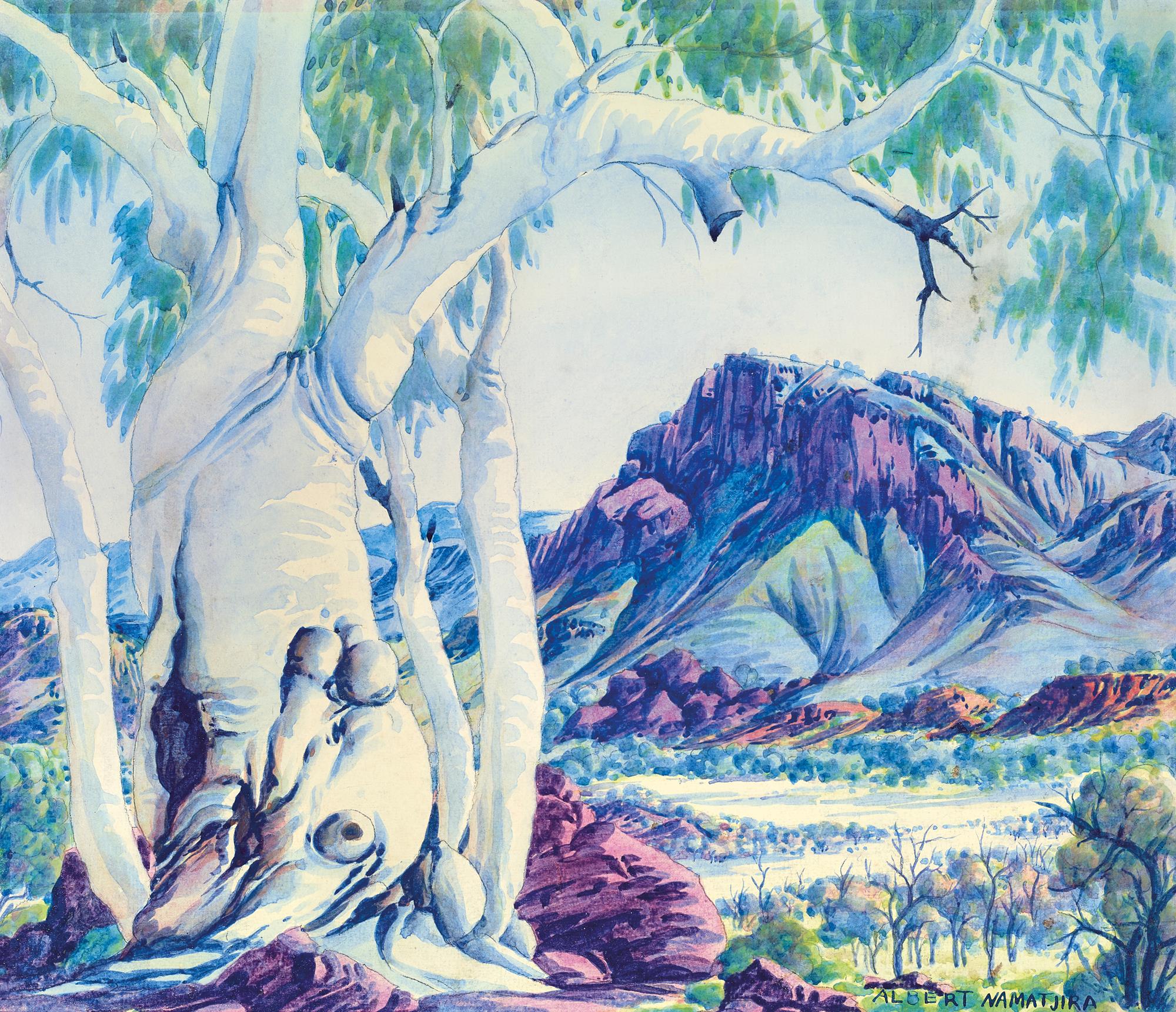 Like many of Namatjira’s finest works, River Gum near Bitter Springs Gorge, evokes the artist’s distinctive compositional type with his much-loved, luminous white ghost gum dominating the foreground, silhouetted against a dramatic, brilliantly coloured backdrop of distant mountain ranges. Balanced on the left side of the composition and reaching beyond the depicted scene, the majestic gum plays a pivotal role not only as a framing device but also as a point of entry into the picture plane. More fundamentally perhaps, the signature cropped tree motif creates a tangible sense of being present in the landscape, of participating alongside the artist in seeing and identifying with the land – thus imbuing the work with an unmistakable intimacy, notwithstanding the panoramic view and monolithic forms. For while immortalising an ostensibly Western-style topographical view of the Central Australian landscape in all its myriad moods and rich textures, such depictions ultimately resonated with important personal symbolism for Namatjira as statements of belonging – coded expressions embodying the memory and sacred knowledge of a traditional ancestral site, his ‘dreaming’ or totem place.