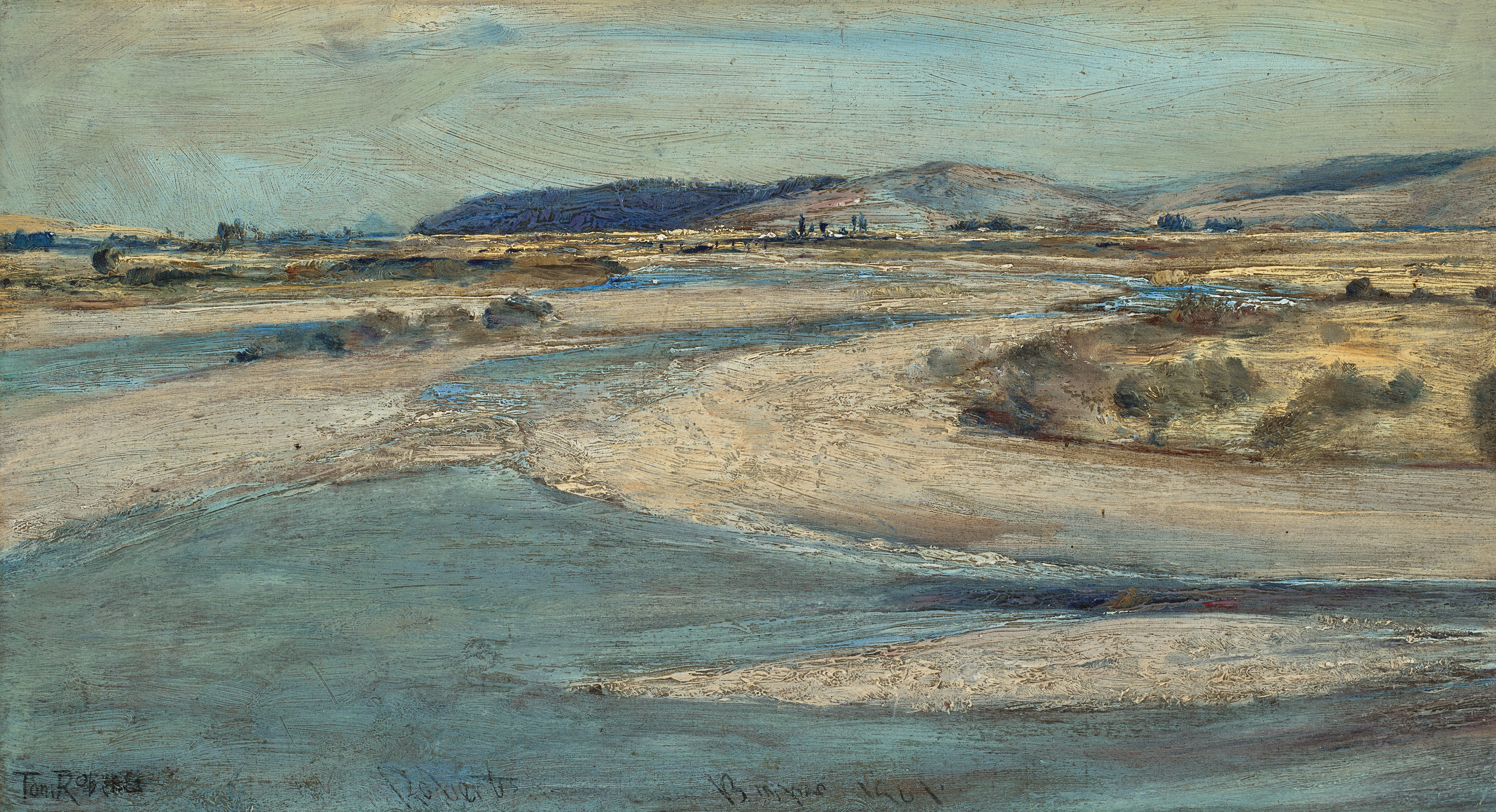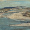 Tom Roberts is renowned in Australian art for his grand vistas of national life, full of the blazing light akin to his fellow Heidelberg artists. However, on closer examination, his palette is more muted than the glare so beloved by Arthur Streeton and in Robert’s smaller works, this becomes even more apparent. Paintings such as Trafalgar Square, c.1884 (Art Gallery of South Australia); Cloud study, c.1889/1901 (National Gallery of Victoria); and Saplings, 1889 (Art Gallery of South Australia) are extremely low key, even foggy, and clearly indicate why he later became so enthusiastic about Clarice Beckett’s paintings which he encountered in in the late 1920s.1 In River Omega, 1901, this delicate sensibility is pronounced in a composition dominated by soft blues and creamy ochre. It is also one of the very few landscapes painted by Roberts during these years.