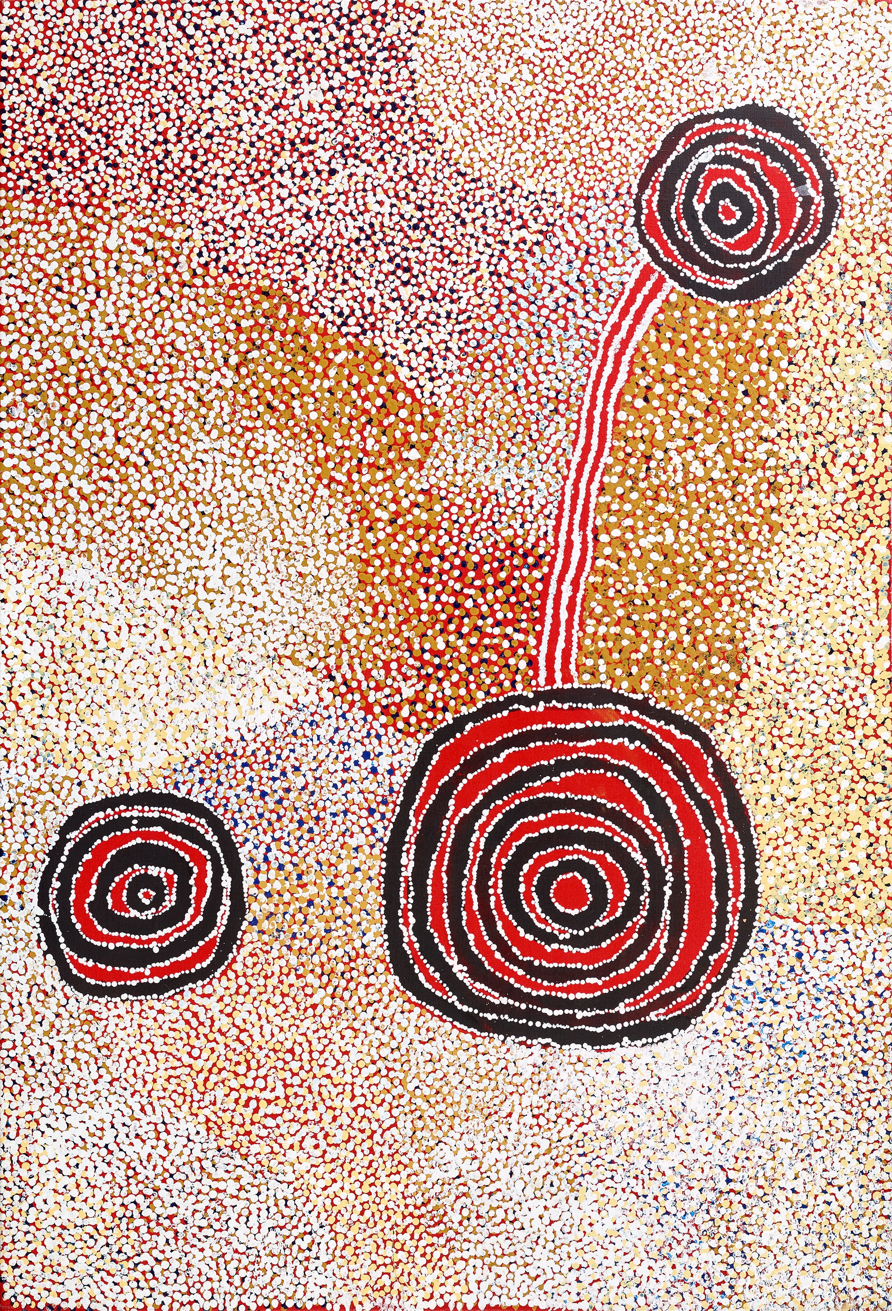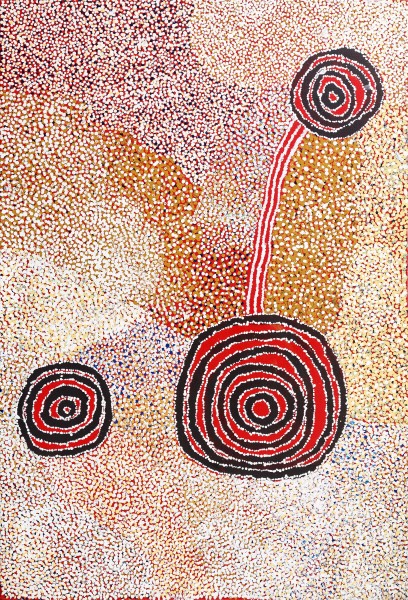 Rockholes and Country Near the Olgas, 2007 is a fine example of Bill Whiskey Tjapaltjarri's shimmering aerial paintings of his birth country Pirupa Akla, located west of Uluru. Completed in the year before Tjapaltjarri died, when the artist was in his late eighties, this work refers to the physical landscape, and to the spirits residing there. Specifically the White Cockatoo story which originated from Pirupa Akla, a creation story of the cockatoo, eagle and their adversary, the crow. The battle between the birds resulted in the formation of various topographical features, such as the rockholes. The artist and his family depended upon these rockholes, and they were a constant focus in Tjapaltjarri's work.