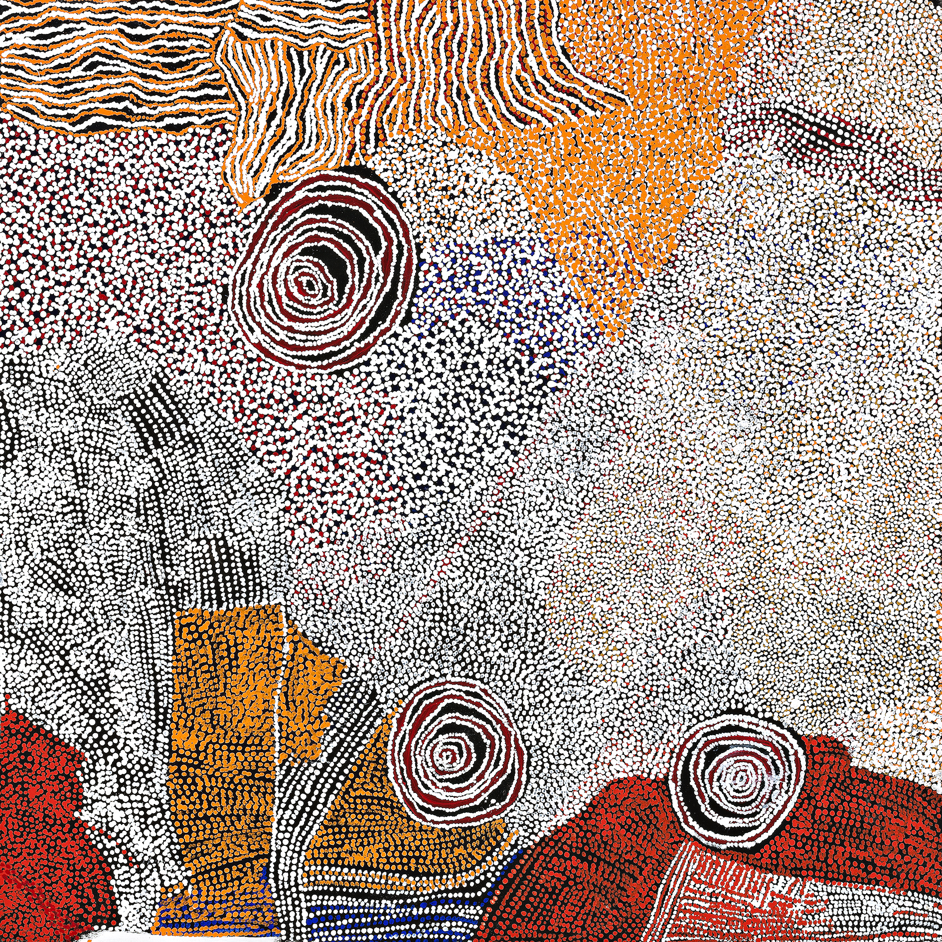 On an optical level the retinal mixing of colours on the densely-worked painting surface, evokes the oscillating refractions of white quartz crystals on brightly coloured desert sand. In this way the whole painting is made to resonate, not just visually, but with the significance of the artist's Ancestral Story.