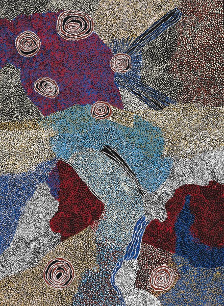 Belonging to Whiskey’s earliest exhibition period, this painting is typical of his subject matter and depicts the rock holes near Pirupa Akla, country located near the Olgas to the west of Uluru. The white areas represent the shimmering quartz country associated with his white cockatoo, crow and eagle ancestral story which involves an epic creation battle between the birds. The rock holes were formed where the battling birds tumbled and crashed to the ground and the shards of white stone depicted here represent the cockatoo's feathers