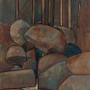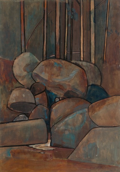 Williams visited friends in Mittagong, New South Wales in late 1957 and the subject matter of this work, painted in moody blue and brown tones, connects it to a series of paintings including Landscape with Rocks I, 1957 – 58 (Metropolitan Museum of Art, New York), which was made in response to the surrounding landscape. Gouache, a quick-drying medium composed of watercolour mixed with white pigment (which renders it opaque), was for many years his preferred medium for painting outdoors and as this example shows, in Williams’ hands, it also offered something of the richness of oil paint in terms of the pictorial possibilities and textural manipulation it allowed. The compressed space of the image reveals the influence of the post-Impressionist painter, Paul Cezanne, and hints at the radical distortions of perspective that would follow in Williams’ later work. Similarly, the vertical saplings – with leaning and fallen boughs beyond – point to the increasingly abstract and pared back images of the bush for which he subsequently became renowned.