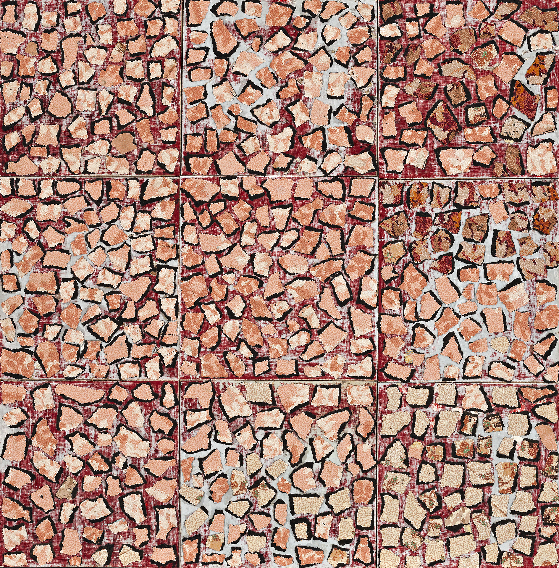 Occupying that space between ‘the world and the world of art’4, Rose Pink, 1992 is an impressive example of the artist’s assemblages constructed from discarded, sun-baked sheets of linoleum: ‘…terrible stuff really… you don’t see it much, it’s difficult to get. But people used to line their kitchens with it…’5 Despite the material’s obvious domestic connotations however, such works are unequivocally of the ‘outdoors’ – for example, the very closely related Midsummer, 1992 (Private Collection) with its pulsating red palette embodying the searing heat of summer; First Fruits, 1991 (Metropolitan Museum of Art, New York) featuring green linoleum reminiscent of ‘green leaves and apricots in various stages of ripening…that was straight out of Nature. Leafage…’6; Cow Pasture, 1992 (National Gallery of Australia, Canberra) where the floral-patterned medium juxtaposes corrugated iron, characterising the combination of flowers, parsley and manure of cow paddocks; or her monumental Lambing, 1991 with its torn pieces of white weathered lino (‘sheep shapes’) haphazardly arranged to depict the chaos of that season.