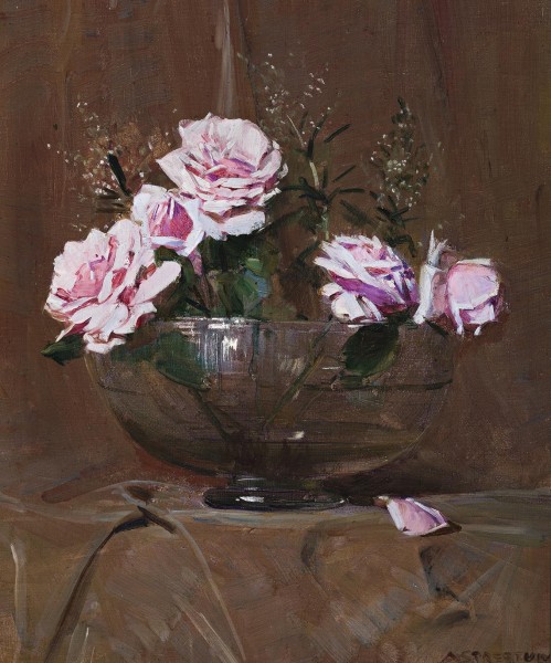 Flowers are among the most beautiful creations of nature as we are often reminded by poets and the gifts of lovers. The Bible tells us that 'even Solomon in all his glory was not arrayed' like the lilies of the field; and Shakespeare's Juliet said '... that which we call a rose / By any other name would smell as sweet'. They were Arthur Streeton's favourite, both as gardener and artist, especially when he was living in Melbourne's South Yarra and then at Olinda in the Dandenong Ranges. As his love of roses grew, they appeared more frequently in his exhibitions, reaching a climax in his 1932 show at the Fine Art Society's Gallery, Melbourne. Titled Exhibition of Roses, it included eight paintings of various varieties – Roses, Silver and Silk; Roses, Deep Red and Green; and Roses Pale in Silver Bowl being among them. The poetically inclined titles reflect the artist's lyrical approach, so redolent of Roses, La France, c.1933. The painterly subtleties of the setting compliment the seductive pinks and textured petals of the flowers, formed and highlighted by the masterly play of light and shade. The bravura technique gives added immediacy, increasing the affinity between artist and viewer as they identify in sharing the moment of exquisite beauty transcending the transience of nature.