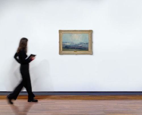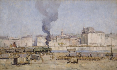 It is tempting to speculate that this perspective of Rouen, seen from the Gothic Revival Basilica Notre-Dame de Bon Secours outside the city, is ‘the view’ that Streeton refers to in his letter. Looking down a gently sloping, grassy hill, past rows of small houses towards the centre of Rouen, the painting adopts a broad view of its subject, taking in the pale blue river that meanders through the landscape, flanked by towering industrial chimney stacks and other buildings, all brought together under a vast open sky. Streeton was a skilled painter and his love of his medium and facility with the brush is on full display in this work. Broad, lively brushstrokes impart a sense of dynamism and movement within the depiction of the overcast sky, while quick daubs of paint describe yachts and other vessels on the river, as well as the smoke that emanates from the chimney stacks.