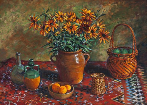 The artist endlessly found magic in the unremarkable, revelling in the beauty and warmth of her Paddington terrace home. The balance and harmony found in Rudbeckias with Cane Basket reflects the very essence of the artist's own domestic existence. As her close friend, Barry Humphries poeticised: