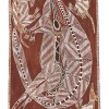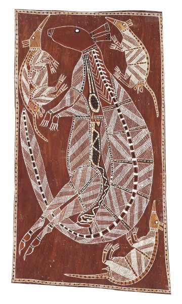 The x-ray style of painting employed by Yirawala is characteristic of western Arnhem Land art and here features the internal organs of the kangaroo (the heart, liver, stomach and intestines), as well as the ribs and backbone, thus linking the image to death and the burial ceremony. The figure of Kundaagi is decorated in clan designs such as those painted onto the bodies of performers in the ceremony. Yirawala has drawn a variant of the design onto the figures of the three northern bandicoots which are likely to represent young initiates, probably from a different clan to that of the deceased, who attend Lorrkkon ceremonies for educational purposes. Kundaagi and the Lorrkkon ceremony is a recurring theme in Yirawala’s oeuvre.