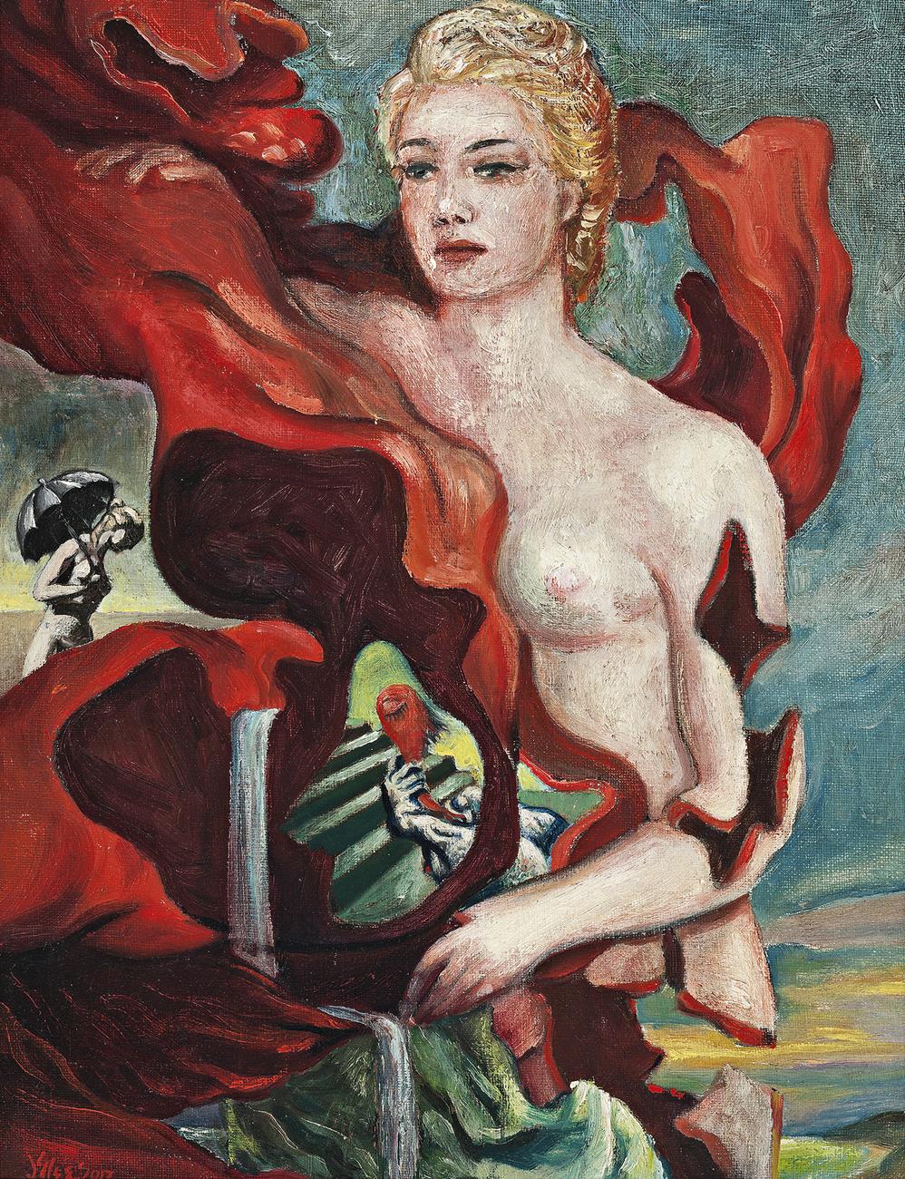 Gleeson was always the first to point out that he was a child of war, having been born within the shadow of the conflict of 1914 – 18. By the time he started his studies at the East Sydney Technical College, he had already absorbed many of surrealism’s ideas, and ‘trained himself in the habit of recording each dream, each nightmare too, that surfaced intelligibly from his subconscious’.2 Moving on to the Sydney Teachers’ College in 1937, Gleeson’s new lecturer May Marsden proved to be a supportive mentor who encouraged him ‘to pursue his interest in Surrealism as a painter rather than a poet. He found that with May Marsden, ’I was taught to free up my work and open up to my imagination’.3 His early paintings were so self-composed and accomplished in their vision that Marsden purchased City on a Tongue, 1938, for the College’s own collection.4 The genesis for many of his subsequent paintings, including Salvage From Random’s Effigy, can already be intuited from this work. Gleeson closely studied the humanity of classical figures and myth as painted by artists including El Greco, Poussin and Blake, but his new visions proudly bore the additional inspiration of contemporaries such as Freud, Dali, de Chirico and Masson. In Salvage from Random’s Effigy, the central female figure unfurls into the landscape as her red shroud, a visual metaphor for one’s unraveling consciousness, flows around her. Intriguingly, the strange biomorphic figure seen through one of her apertures – one eye closed as it struggles up some stairs – bears an uncanny resemblance to a similar ‘creature’ seen amidst a half-built structure in Filigree, 1939 (Deutscher and Hackett, 18 April 2018, lot 13). The waterfall is also a repeating motif, as Gleeson admitted to being fascinated by zones where water and land meet, which, for him, represented a ‘liminal’ border between the rational and the irrational.5