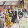 Another such activity which piqued the interest of contemporary visual artists was an art prize administered by the 150th Anniversary Celebration’s Council. In addition to an award of 250 Guineas funded by the Commonwealth Government for a large oil painting depicting an aspect of Australia’s history, smaller prizes were offered for works of various subjects and in various media.4 Beginning work in December 1937 and completing her painting in January of the following year,5 Cossington Smith entered Samuel Marsden After Service at St John’s Church, Parramatta, 1937 – 38 into the category of ‘historical subject in oils’.