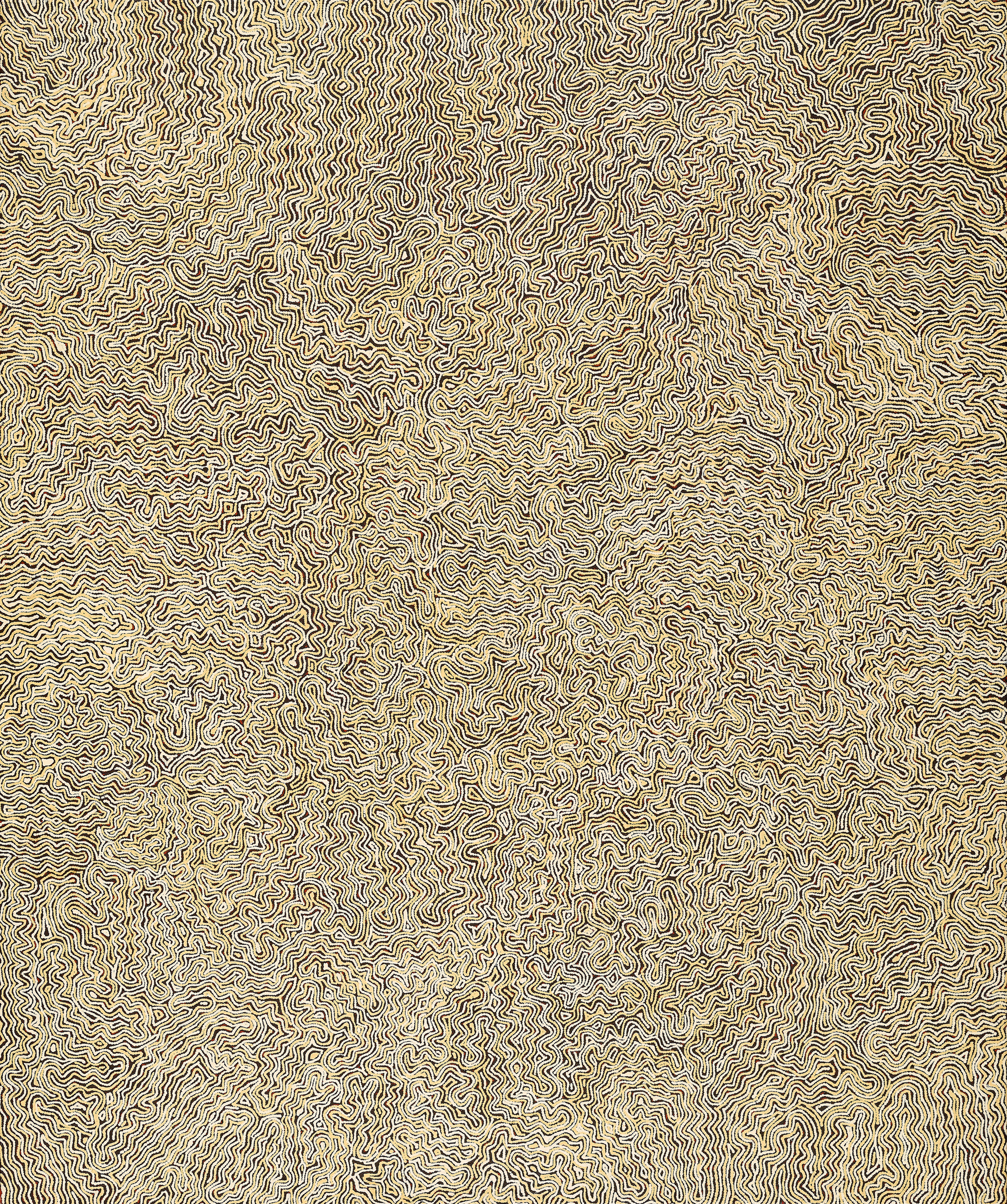 Yunala 2005 was painted in the same year that Yukultji Napangati came to the attention of a wider audience through her inclusion in the Primavera exhibition at the Museum of Contemporary Art in Sydney. Composed of alternating lines created from conjoined white and cream dots on a black and red ochre ground that meander across the canvas, this work creates a three-dimensional land map that articulates her relationship to country and the experience of her upbringing.