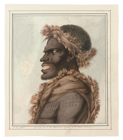 As in most of the gouaches in Le Havre, Petit has not added any background detail (not even some simple foliage), which gives such portraits a dramatic focus. The portrait has a number of precisely observed details of dress and scarification, not only the elaborate clothing, but the man’s full beard, his prominent and dazzlingly white teeth (the remarkably good teeth of the Tasmanians were much commented on by many of the French officers and savants), the hazel eyes, and particularly the scars (short vertical lines on the chest, round dots on the upper arms).