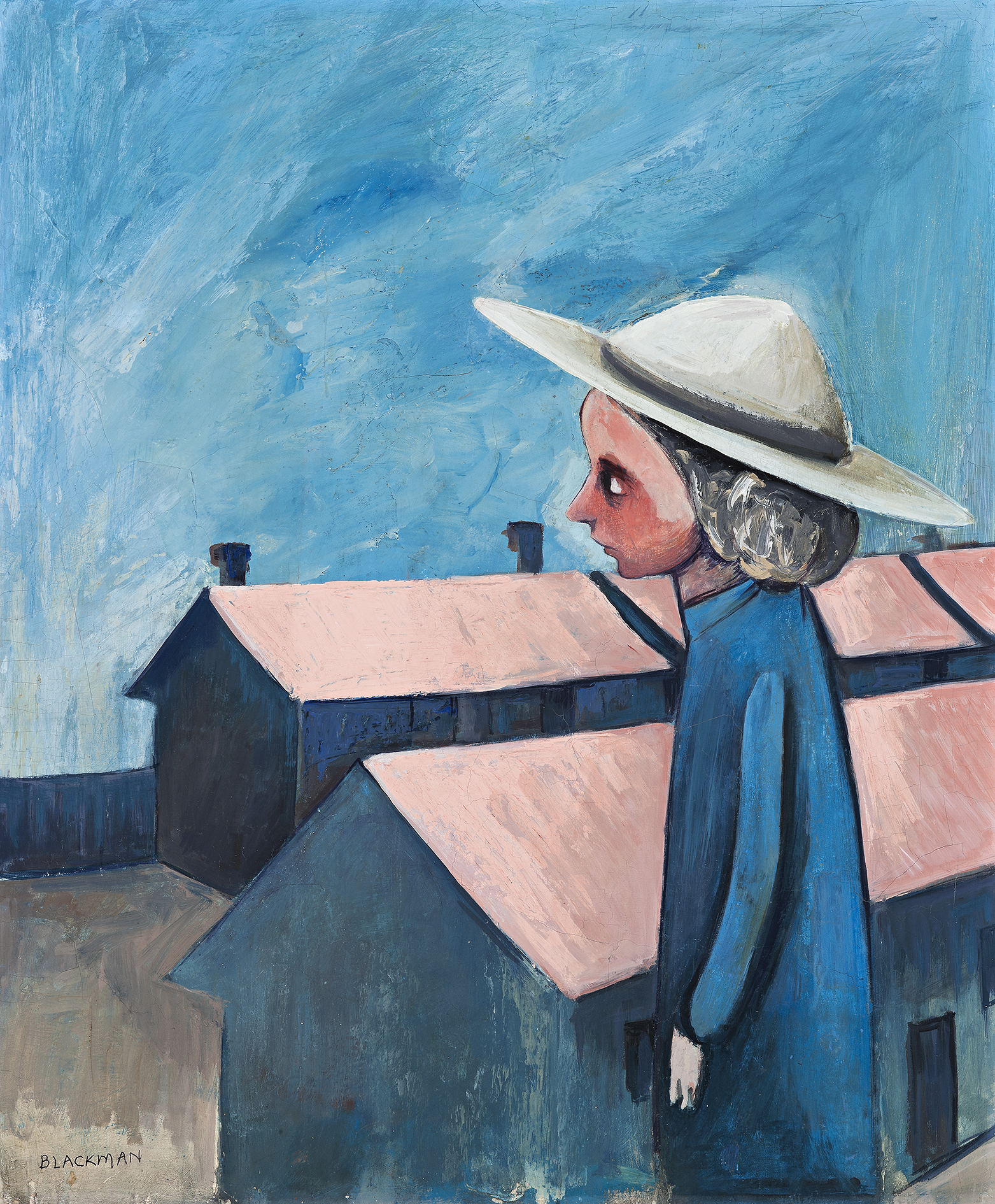 The ‘Schoolgirl’ paintings form Charles Blackman’s first sustained series. Dressed in trademark wide hats, the girls inhabit a netherworld of vaguely familiar architecture, harsh light and menacing shadow. In the early 1950s, Blackman and his wife Barbara were living in a converted stable in Hawthorn where ‘we were surrounded by thousands and thousands of schools and schoolgirls.’1 Blackman covered the walls with his paintings and drawings, adding to them every day in a frenzy of work. In September 1952, a university friend of Barbara’s (Betty Shanks) was murdered, a crime that remains unsolved to this day. The effect of this distressing event on Barbara was no doubt compounded by her encroaching blindness. In response, Blackman had already started routinely reading to his wife and this activity sharply increased the significance of the written word for them both. ‘It was at this time too that I started to read Shaw Neilson – I didn’t actually start painting schoolgirls because Neilson wrote poems about them, but I found his poems when I was about halfway through this period and I thought them very beautiful … he had very bad eyesight and he used to write about things in a certain kind of way – he used to write about these things using these emotional powerful throbbing colours; they seemed to come out of the poems, you see, terrific things!’2 Another source was the remembered tale of the brutal murder of 12 year-old Alma Tirtschke near the city’s Eastern Markets in 1921. All these influences ‘sowed the seed for theme of innocent schoolgirls and lurking men.’3 Painted in acerbic pinks and blues, the girls walk through deserted alleys, play in schoolyards with their eyes averted or, in the case of Schoolgirl and Buildings, gaze longingly over anonymous buildings, ‘their eyes laced with black laces.’4