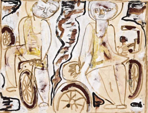 In the introduction to the catalogue for Ian Fairweather's nationally touring retrospective exhibition of 1965, curator Robert Smith wrote, ‘In his paintings Ian Fairweather has always been concerned with people – not as individuals, not as types, but as people: part of the vast unfolding tapestry of life’.1 In Scooters, 1950 line effortlessly captures and expresses movement as much through the figures of the young people as the scooters themselves. Murray Bail in his monograph on Fairweather refers to its ‘deliberate awkwardness’.2 It is an awkwardness, to my mind, that extends the feeling of movement and captures that feeling of momentary imbalance one may have when riding such wheeled vehicles – riding a bike or scooter is not always an elegant activity. This is allied to a feeling of freedom, colour free of form, line following its own circuitous fascinations, tapestry-like in its frontal, frieze-like and flattened patterning. There is a sense that the pigment is about to free itself from reality, the painting beautifully balanced between figuration and abstraction. As Fairweather said, ‘... I don't feel I am a complete abstractionist – I still like – perhaps mistakenly in this age of collectivism – to retain some relic of subjective reality’.3 The seeming simplicity of the work is arresting – a few gestures of line and colour and a work of fascination is created – a sure measure of Fairweather's masterly creativity. As fellow-artist and art critic James Gleeson wrote about Fairweather's art in general, ‘He can evoke a world of subtly fluctuating values with a palette almost entirely restricted to a range of earthy browns and greys that lie anywhere between black and white and are cooled or warmed with suggestions of blue or rose. With such limited means he conjures up organizations of colour that rival the lustre of a grey pearl’.4