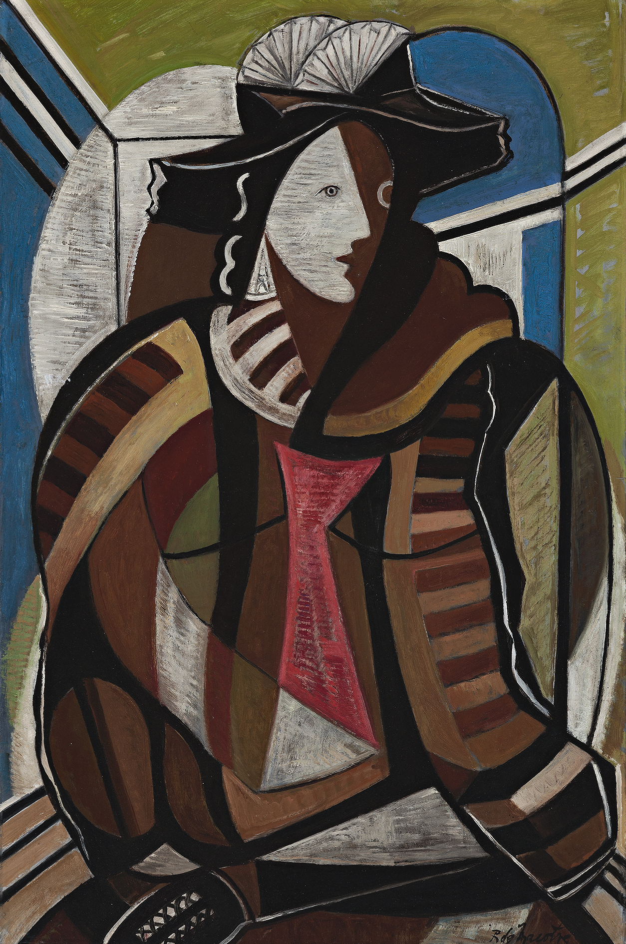 De Maistre also initiated a personal regime whereby he would often do multiple versions of the same subject, stating that ‘I find one must continually repeat oneself to define the meaning, until the moments of contemplation and the moments of creation fuse together.’;2 and Seated Figure (Portrait of Ann, Lady Butler), c.1954 is one of three known versions of the subject. Ann, Lady Butler, was the mother of one of the artist’s closest friends and patrons Rab Butler, whom de Maistre had met in Sydney in 1927 whilst Butler and his wife Sydney (née Courtauld) were honeymooning. The original portrait of Lady Butler (c.1935) is directly representational but austere, one where ‘de Maistre used the sitter’s clothes, fur, long earrings and hat in the dramatic way she used them herself, to echo the assertive person inside.’3 It would be almost twenty years before de Maistre returned to the subject, creating two further works underpinned by a schematic Cubist-informed design. The larger painting (Seated Figure (Ann, Lady Butler), 1954) is in the collection of the Ulster Museum, Belfast. In both, de Maistre employs Picasso’s dual-portrait face, where one half appears as a profile. Picasso particularly employed this technique during the early 1930s in works such as Marie-Thérèse, face and profile 1931 (Solomon R. Guggenheim Museum) and Girl before a mirror 1934 (Museum of Modern Art); and it should be remembered that these were the key years when de Maistre and Francis Bacon were studying his work. There are subtle differences between the two abstractions – in the detail of the earrings, the wave of the hair and the fans of the headdress – but both reveal the artist’s firm control of brushwork, alternating passages of smooth paint with stippled areas to emphasise visual interest. The reworked setting for Lady Butler is also of note, with the fragmented lines of the wall space evoking de Maistre’s own famed studies of Francis Bacon’s studios in the 1930s.