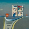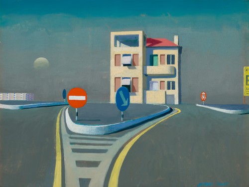 The solitary townhouse in this study is an invention. There was no small building precariously sited on a traffic island. Instead the artist devised it from architectural drawings in his sketch books, then finished his paint with an orange hue and shadows to convey illumination from a setting summer sun. The accompanying road markings—which feature in several 1970s paintings—are adapted from the Arezzo turnoff on the A1 motorway from Rome to Florence. The artist used variants of this configuration to display his mastery of geometry, always having one edge curve gracefully upward. Optically he also used turnoff markings to lead the viewer’s eye through the centre of his compositions, while also stabilising an overall design. The remaining elements in this study are five signs and a very distant building. Smart positions them evenly along his horizon line, using colour and size to highlight the ‘No Entry’ traffic sign on the left of centre. With it Smart uses the white bar against red to echo the horizon behind, while he has the sign’s circular shape also rhyme visually with the adjacent ascending moon, an identically sized blue disc in the serene sky.