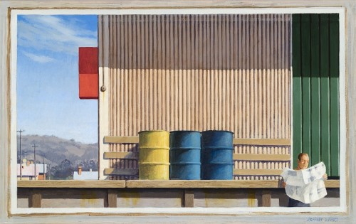 While Smart’s final paintings are immaculate in composition and finish, as witnessed by the above-mentioned Morning, Yarragon Siding, his oil studies by contrast reveal an absorbingly immediate response to the motif. As such, they are often more personal by being so revealing. The freer application of paint in Second Study for Morning, Yarragon Siding exudes an enthusiasm that refined for the final work. This initial enthusiasm allows him the indulgence of an earlier fascination with texture, of timbers and other constructions, which contrasts starkly with the captivating plein-air quality of the landscape to the left. Painted in the tantalizingly traditional manner of Tom Roberts and the nineteenth-century Australian Impressionists, Smart thus juxtaposes nature with the contemporary world’s hard-edged realism in the siding and its hints of flat surfaced, geometric abstraction. Smart invites us to compare the two as both equally worthy of consideration as good art. And in this second study, even the face of the man reading the newspaper is revealed, while the final version gives way to greater order. Detailed construction and stronger light dominate the landscape; and the lines and corrugations of the railway shed are more pronounced. The balance between verticals and horizontals is developed as a prominent feature of the carefully considered composition; and as the face disappears behind the newspaper, the now impersonalized figure is obliged to adopt the traditional role of being included purely for scale. If the colour composition is more sophisticated, it also has greater formality. Finally, the addition of the large number ‘2’, designating the particular railway siding, provides the artist’s ultimate seal of approval through his happy addiction to including (often enigmatic) words and numbers in his paintings. In music, the study and the finished painting might be likened to a prelude and a concerto. Both are excellent in their individual ways.