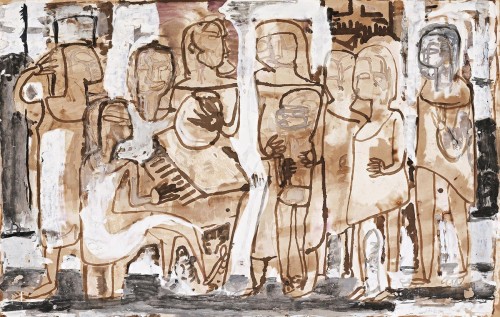 Painted on a large sheet of paper, this work employs Fairweather’s fluid and calligraphic line to describe a group of standing figures gathered around another who is seated and playing a piano. This subject appears again in the later work, Palm Sunday, 1951 (Queensland Art Gallery, Brisbane) but in its immediate, edgy treatment, the spaces between the figures filled in with expressively applied fields of black and white gouache, Self-Portrait has more in common with the plainly titled Hell, 1950 (Ian Potter Museum of Art, University of Melbourne), the claustrophobia of which clearly spells out the emotional temperament of its maker. Rather than depicting himself, Fairweather has produced what Murray Bail interprets as an inverse self-portrait in this work,5 the convivial crowd gathered together in the joyous collective act of making music the opposite of his isolated and increasingly desolate state.