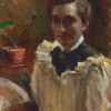 Self Portrait shows Muntz Adams as she wanted to be seen – active, industrious, and above all, creative. A gifted pianist and the eldest of seven children, she was born in Kyneton before the family moved to Prahran, where her father was subsequently elected Mayor. Her mother was a supporter of the suffragette movement, and her younger sister became one of the earliest female science graduates of the University of Melbourne. Muntz Adams began her art training at the age of fourteen at the Prahran School of Design before enrolling at the Gallery School in 1882 under George Folingsby. Her major student painting, Care, 1887, was so acclaimed that it was purchased by the Queensland National Art Gallery, Brisbane - thereby becoming the first painting by an Australian artist to enter that collection.3 In Europe, she studied initially at the Académie Colarossi in Paris, which encouraged a greater freedom of expression than the more popular Académie Julien; and in 1892, Muntz Adams achieved the notable distinction of having a portrait ‘hung on the line’ at the Paris Salon. She then chose to study under renowned portraitist Hubert von Herkomer in the English artists’ colony of Bushey ‘where between 200 and 300 painters have settled partly out of respect for the great portrait painter and partly because Bushey has a certain fascination of colour.’4 Muntz Adams returned to Melbourne in 1896, married two years later and moved to Brisbane. However, she continued to exhibit overseas and in 1899, was awarded a gold medal for portraiture in the Greater Britain Exhibition in London.